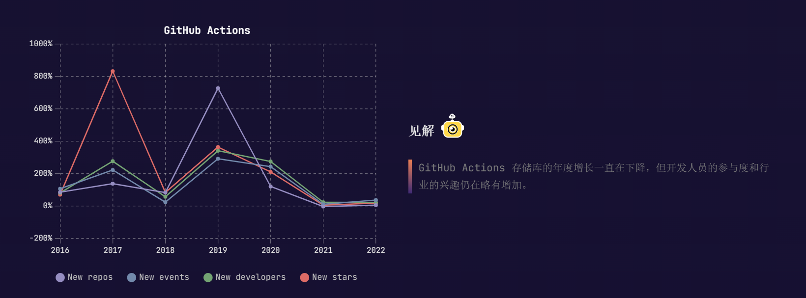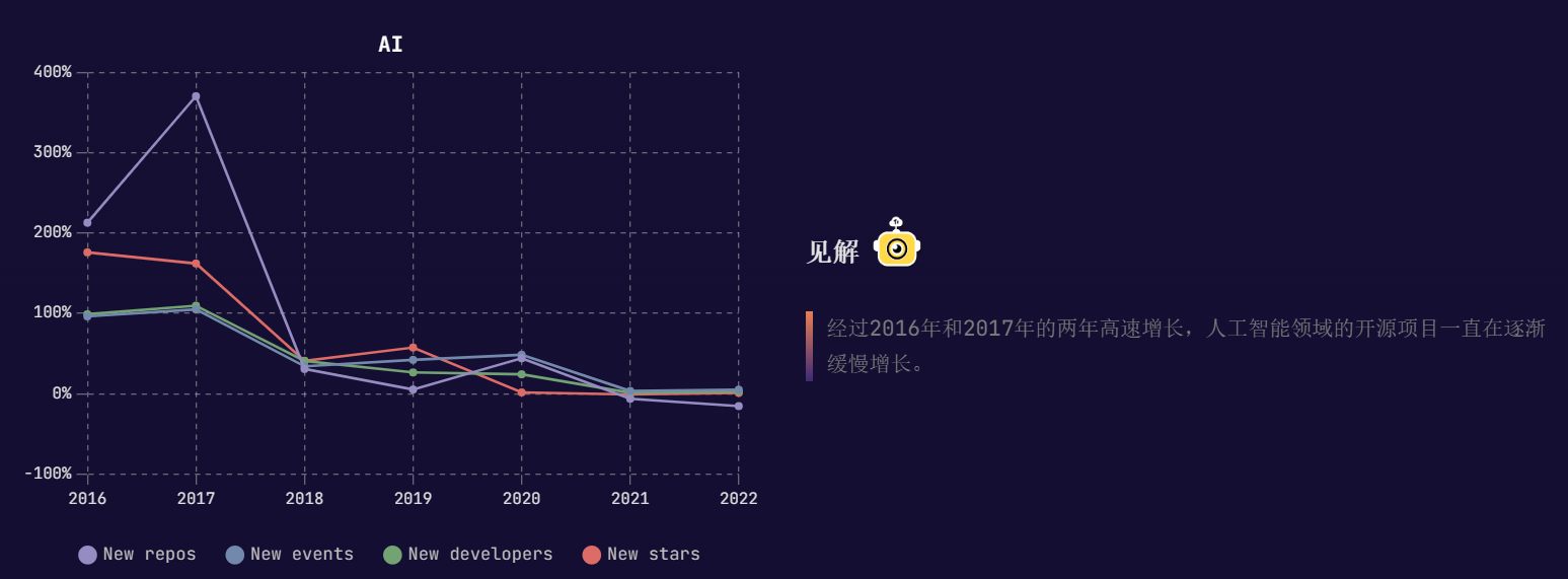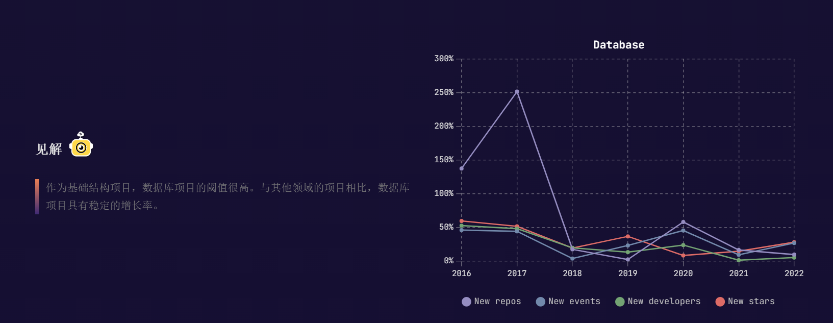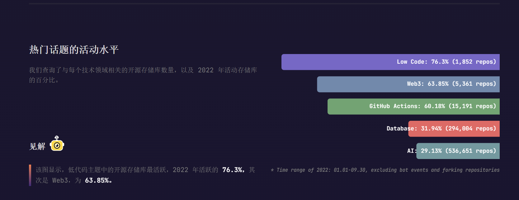 除了关注语言本身,我们其实还更应该去关注领域,这可以帮助我们判断进入哪个行业更有发展前景,从报告中可以看出2022年低代码平台非常的火爆,它的新项目增加了313.43%,在2022年初的时候,很多人都不太看好低代码平台,现在看起来这个领域还是很有前途的,就算你做为程序员这件事有些不屑,也值得你去关注。