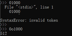 在Python 3.x中,表示八进制字面量的方式只有一种,并且必须写成 “0o1000”这样的方式,原来的“01000”的方式不能使用了。