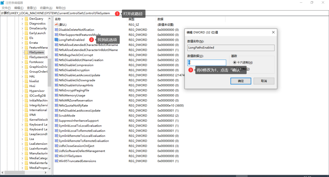 打开运行输入regedit复制路径粘贴路径:HKEY_LOCAL_MACHINE\SYSTEM\CurrentControlSet\Control\FileSystem敲回车,找到LongPathEnabled,将值修改为1即可。