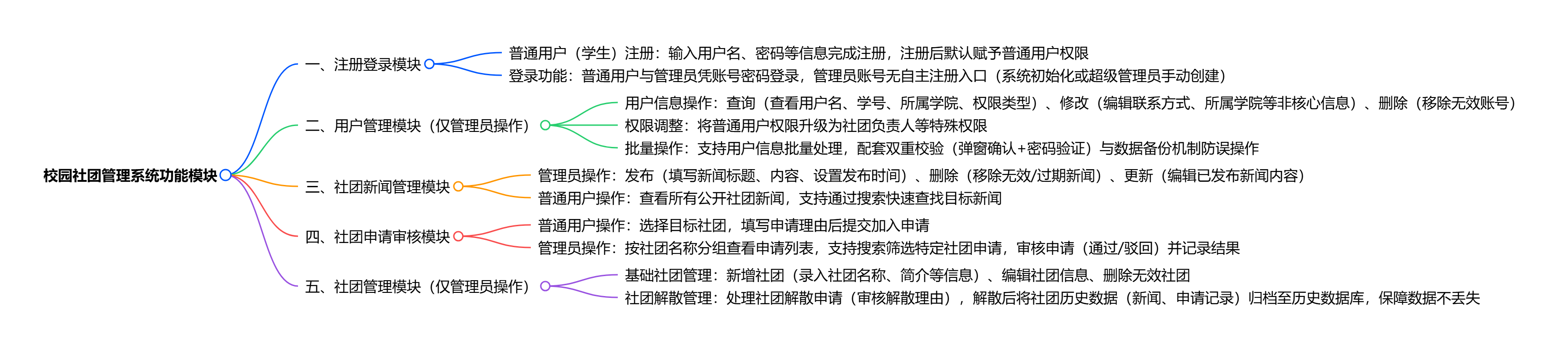 该系统围绕校园社团管理核心需求,划分管理员与普通用户两类角色,核心功能涵盖五大模块: