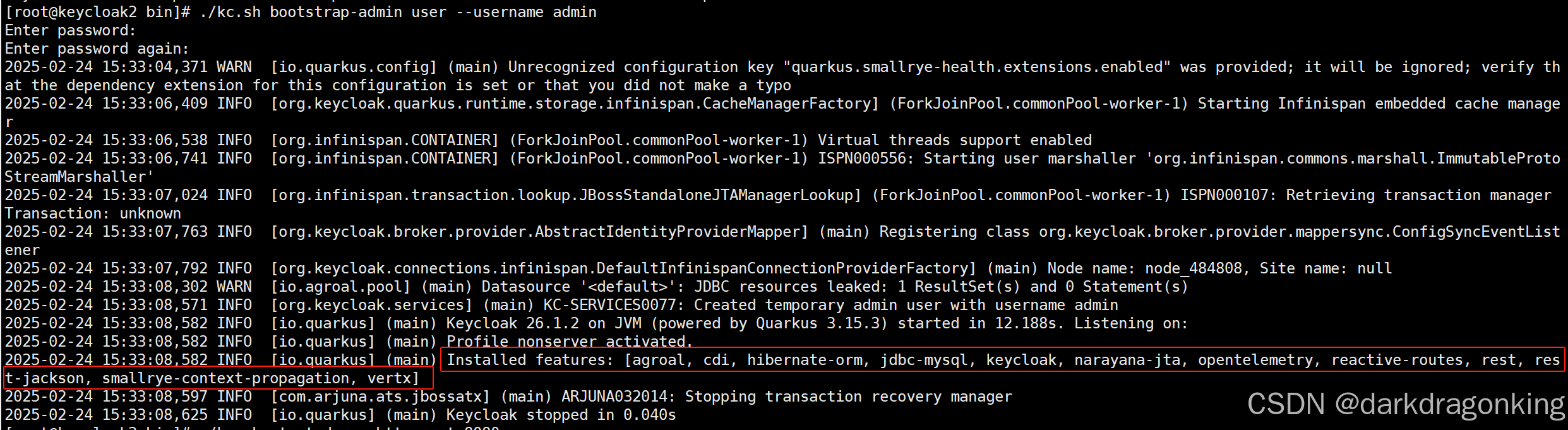 执行上面命令的过程中,会让你输入密码并二次确认。执行过程中会告诉我们已经初始化了一系列内容,如下图的红框中所示。(PS:其实应该先创建 admin 用户,然后再以dev模式启动keycloak 才对吧。。。是我上面的次序错了吧。。。)