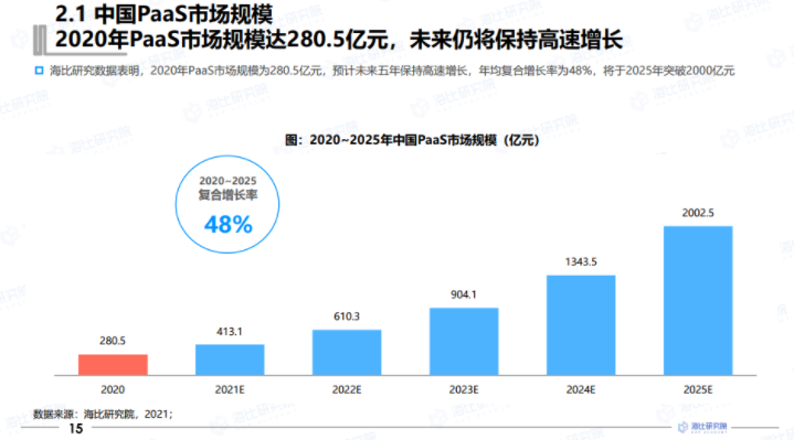 根据海比研究院2021年的两份市场研究报告,中国市场整个PaaS行业的周期都还处在上升阶段。2020年SaaS市场未来复合增长率为26%,而PaaS的合增长率为48%,将于2025年突破2000亿元。