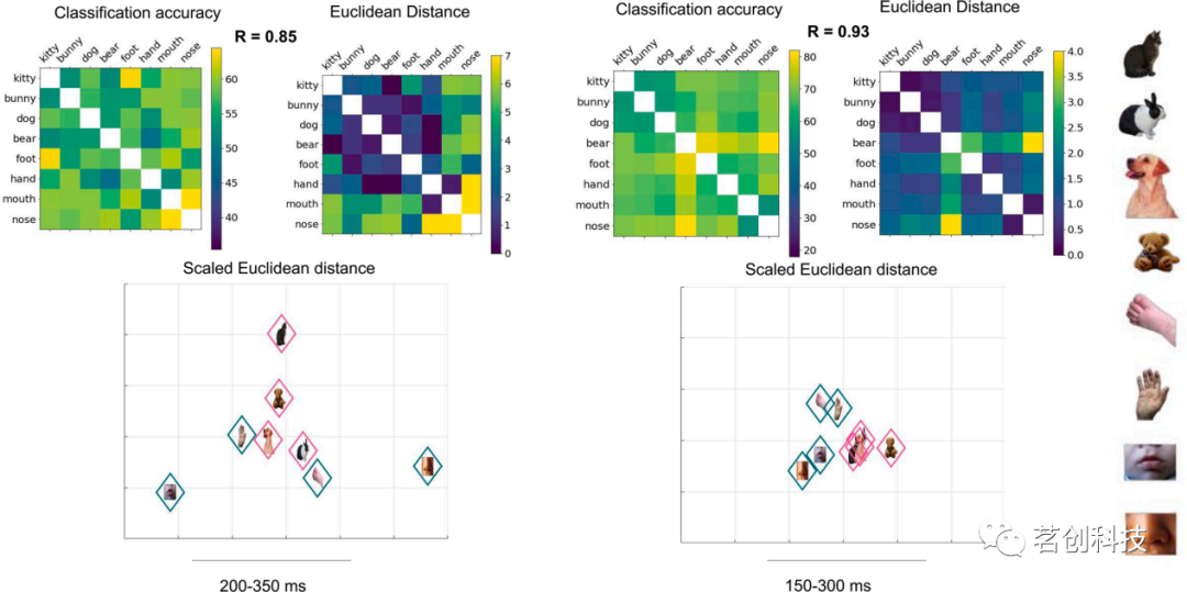图3.上部:婴儿(A,n=10)和成人(B,n=8)的总体RDM可靠性最高的成对分类精度和交叉验证欧氏距离的表征相异性矩阵。在分类精度最高的时间窗口内计算的RDM。底部:多维尺度(MDS)用来呈现二维空间中婴儿(C)和成人(D)的刺激表征之间的欧氏距离。