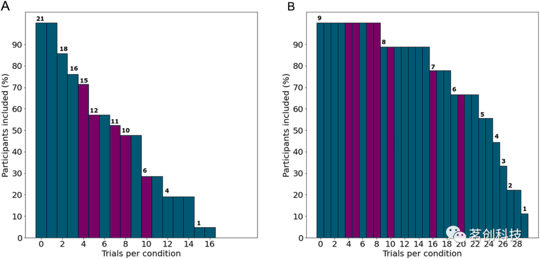 图4.测试数据中包含的参与者人数与婴儿(A)和成人(B)的试次阈值。测试的试次阈值用紫色显示,每个阈值中包含的参与者数量标注在柱状图的顶部。