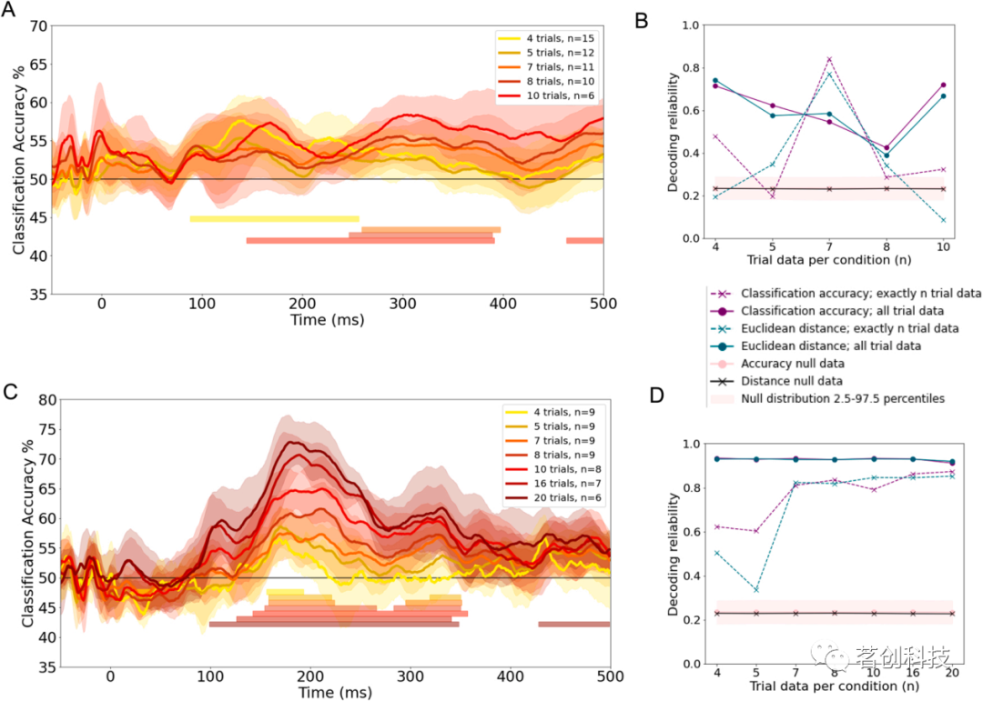 很难收集到足够的有效试次进行分析,这对婴儿研究领域来说是一种阻碍。一般来说,由于不同数据和研究群体的特征不同,不可能预先说明每个刺激需要多少有效的试次才能产生渐近解码精度(即,试图进行分类的最大可能精度)。由于本研究样本数据集的试次重复次数相对有限,因此本研究设计并不支持渐近分类精度,但接下来研究者试图评估数据集收集后的数据纳入决策带来的影响。具体地说,研究者提出了这样一个问题:改变每个条件下的有效试次总数,或者改变每个条件下的最小有效试次数,是否会影响分类精度和估计表征距离的可靠性。
