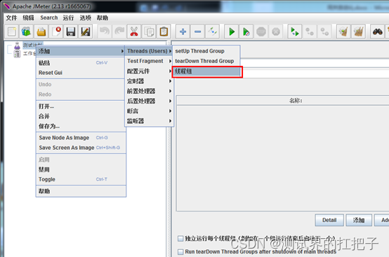 创建线程组。测试计划右键选添加->Threads->线程组。