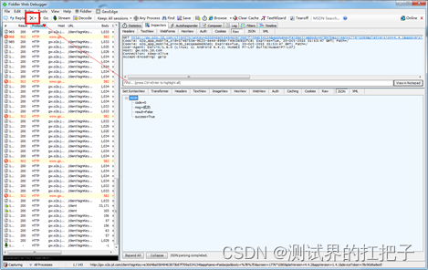 分析Fiddler抓包数据。在右上方结果框中选择Inspectors->Raw即可看到请求的URL、Cookie和Host等有关信息。在右下方结果框中选择JSON就能看到请求返回的JSON字符串。这里的JSON字符串是我们判断请求是否成功的重要依据。