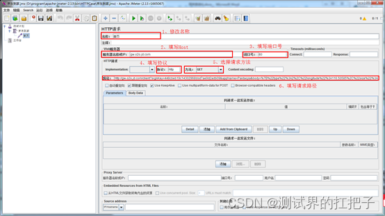 填写HTTP请求相关信息。这一步是关键,需要根据步骤1中Fiddler里那段很重要的信息去填写。名称自行修改,Host、协议、请求方法、请求路径都能够在抓取到的信息中获取,拷贝过来就行。