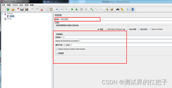 修改名称。修改线程组名称并不重要,根据自己的需要修改就行。由于我们执行脚本一般在需要的时候执行一次就可以,并不需要其他的配置,所以下方的线程属性就保持默认值即可(在进行压力测试的时候就需要进行配置了)。