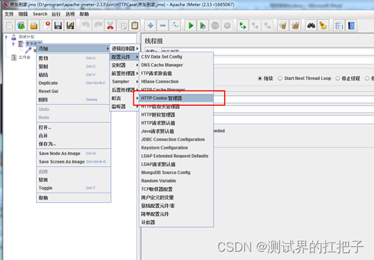 添加Cookie管理器。右键线程组选择Cookie管理器。将抓取到的信息添加至Cookie管理器中。