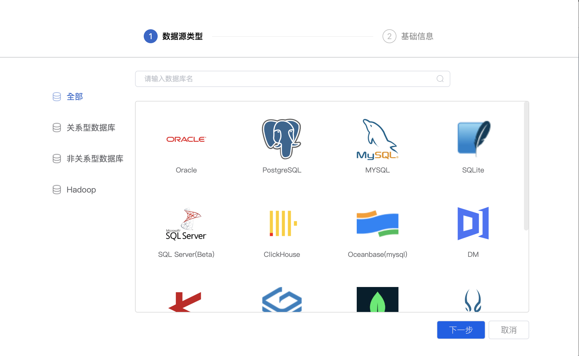 输入数据库的相关信息,包括数据库类型、主机地址、端口号、用户名和密码,点击 “测试连接” 确认数据库连接成功。