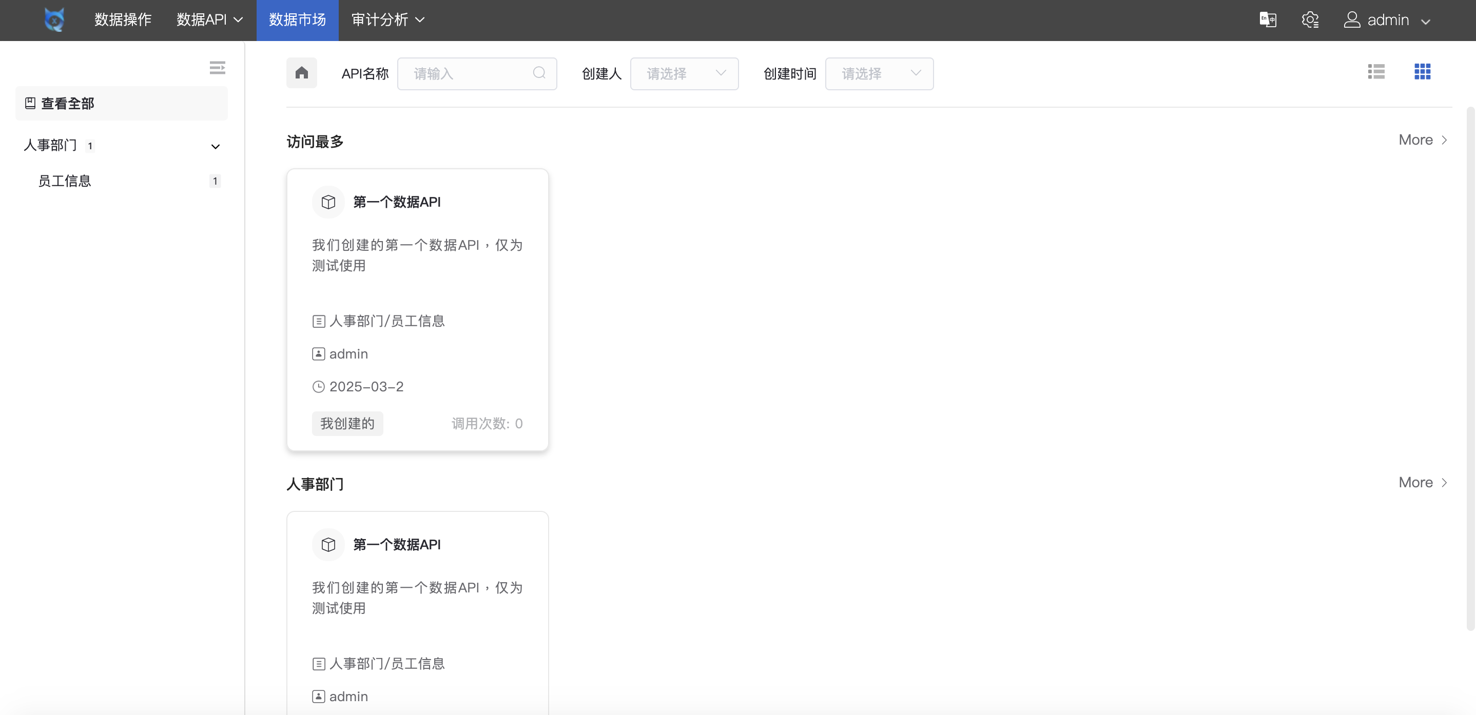 QuickAPI 还支持通过 数据市场 功能,查看已发布的 API 调用次数、请求参数、返回数据等情况,确保 API 的高效使用。