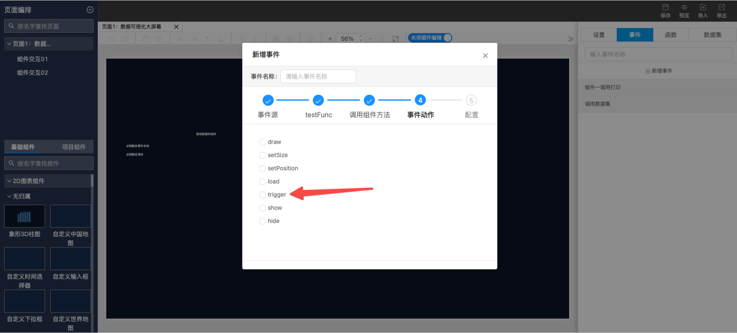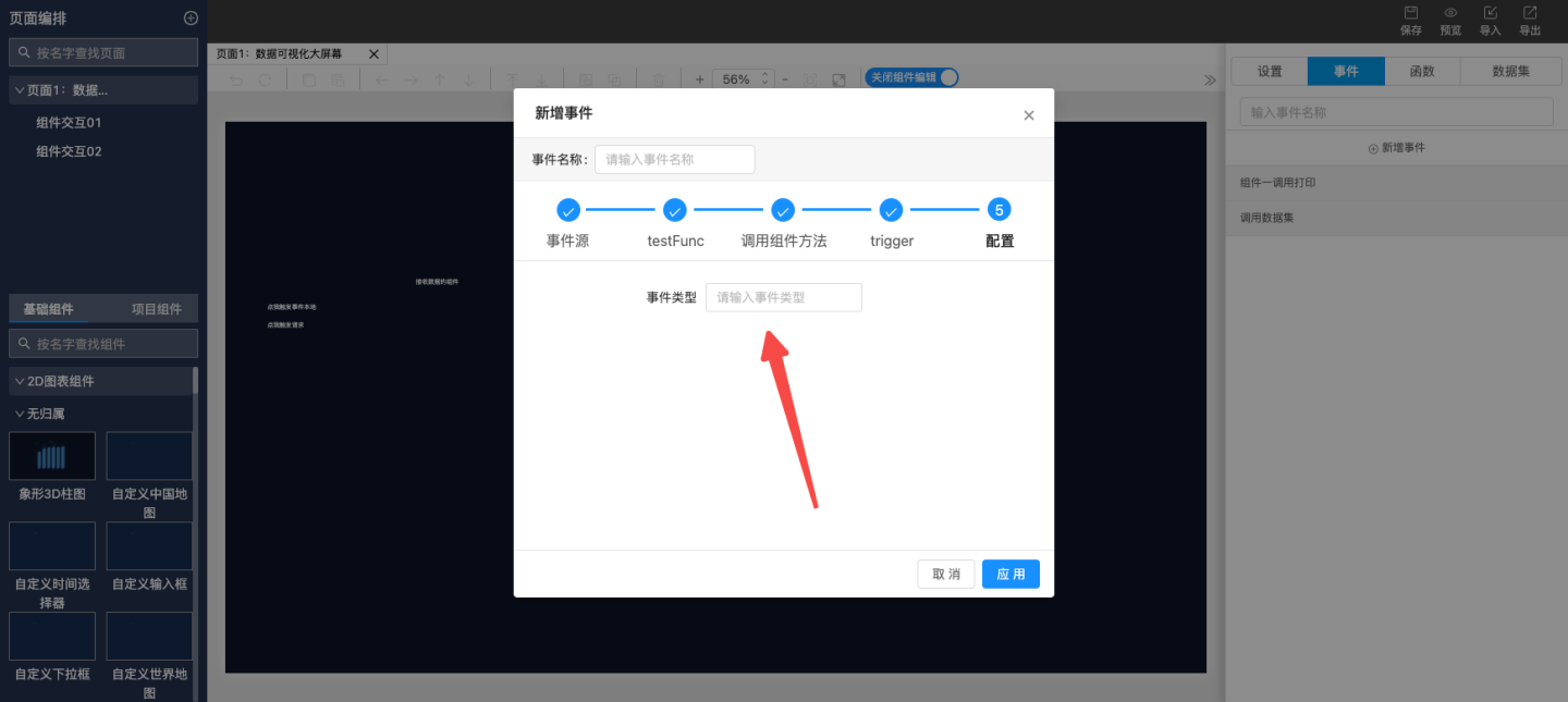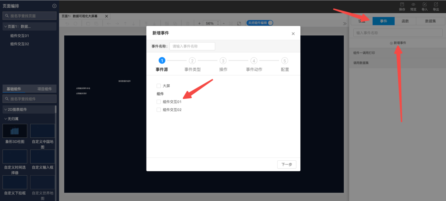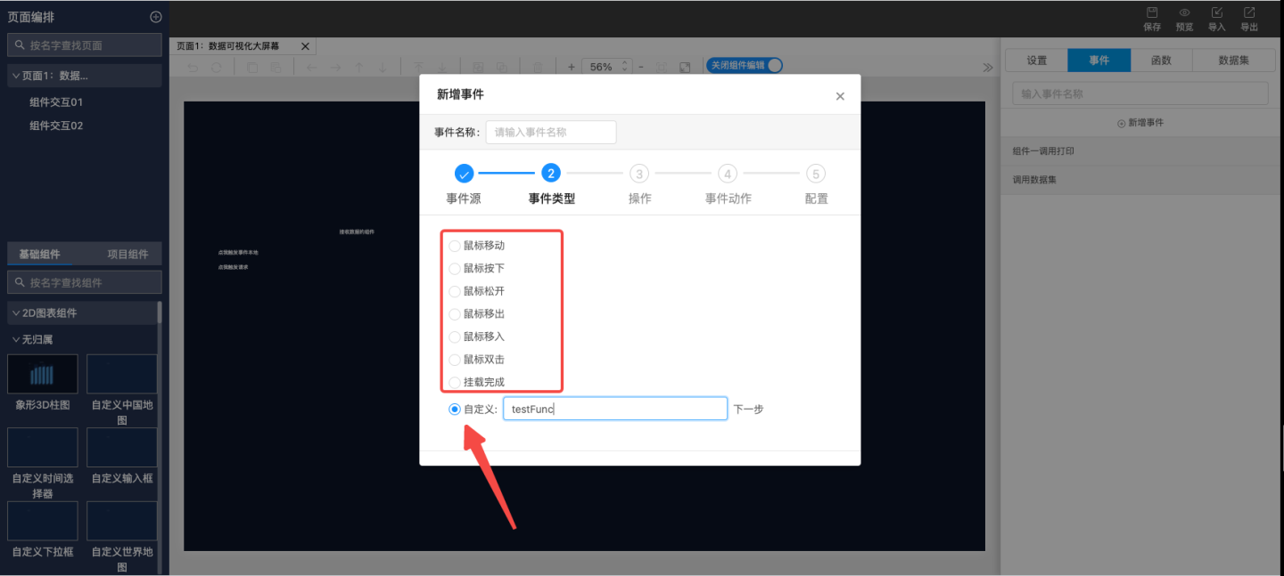 如果选择红色圆圈内的则作用于整个大屏之上,不在于某个组件内,如果选择红色方框则作用于所选的组件内部事件