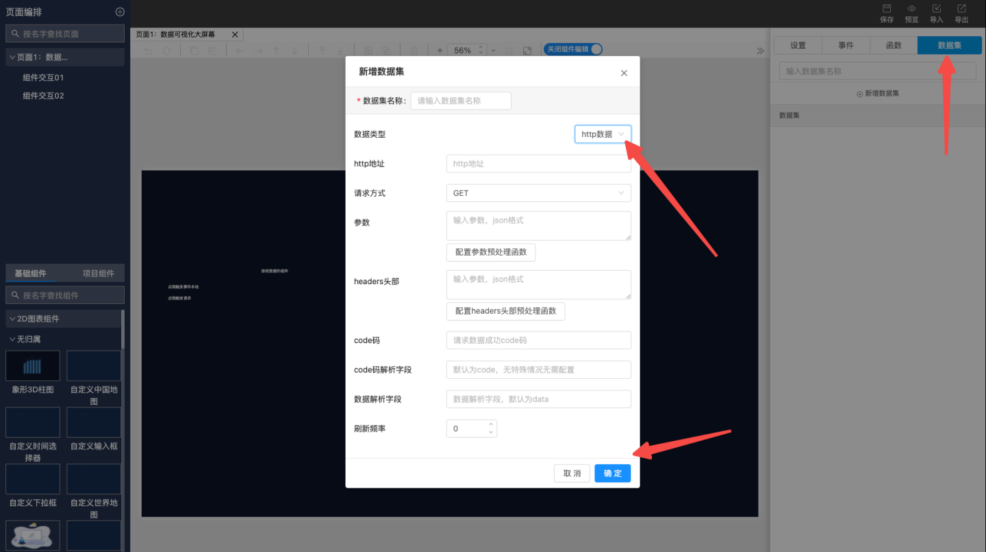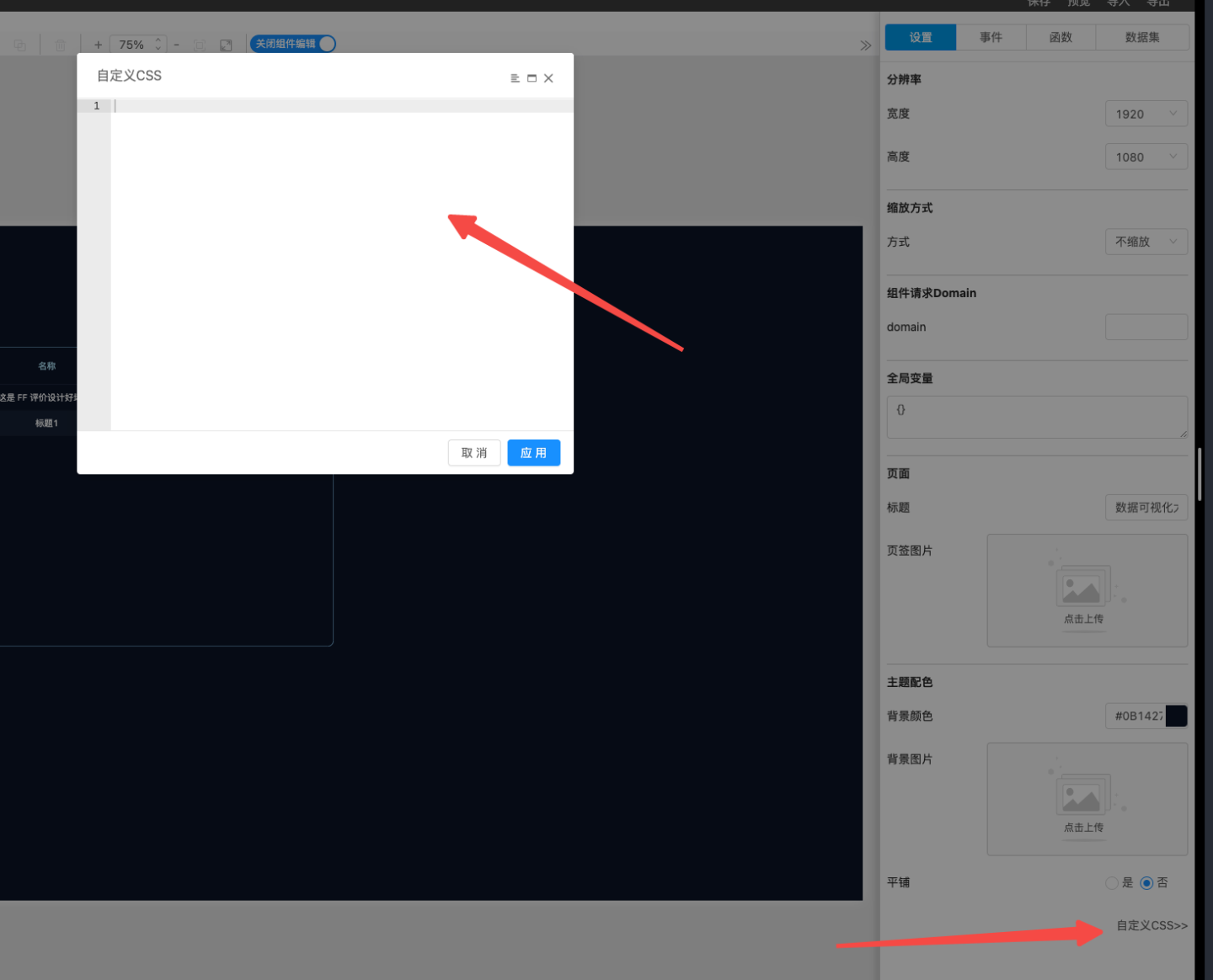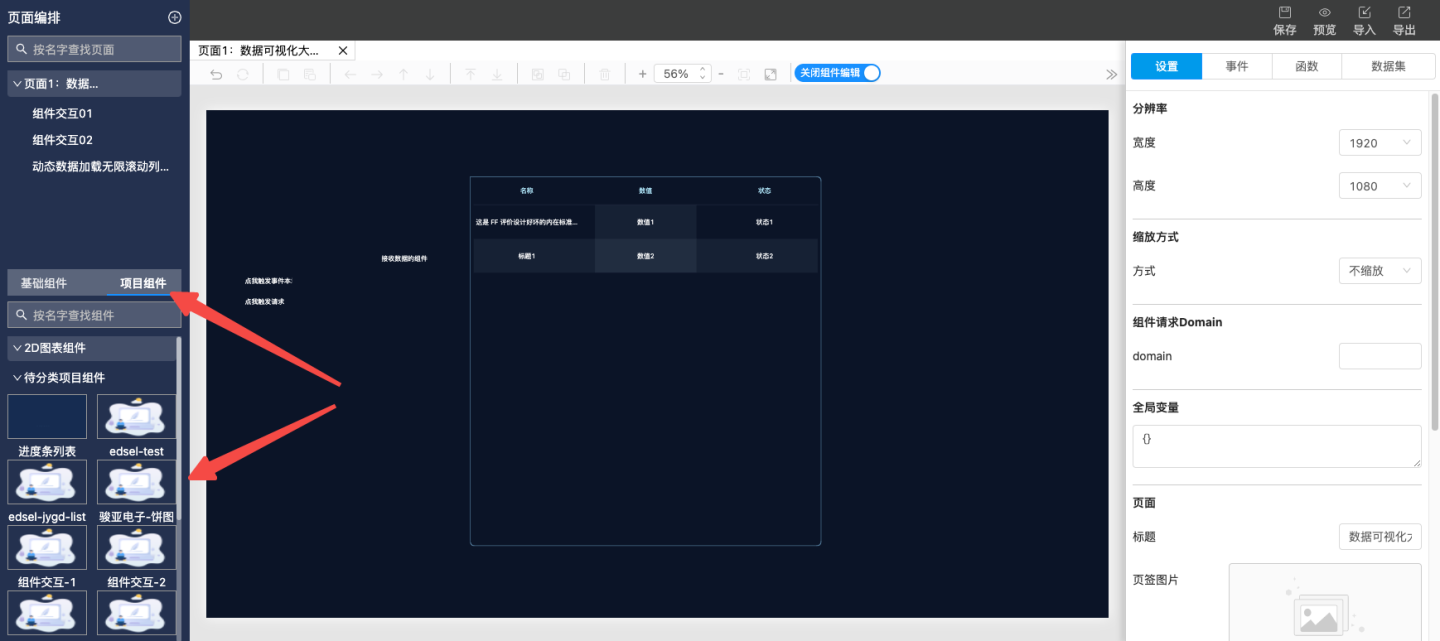 如果选择红色圆圈内的则作用于整个大屏之上,不在于某个组件内,如果选择红色方框则作用于所选的组件内部事件