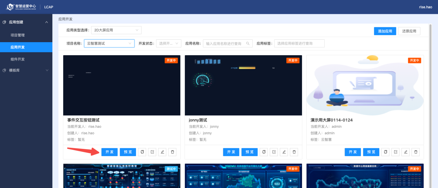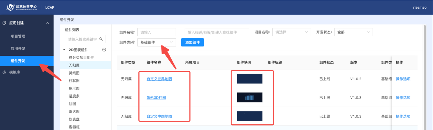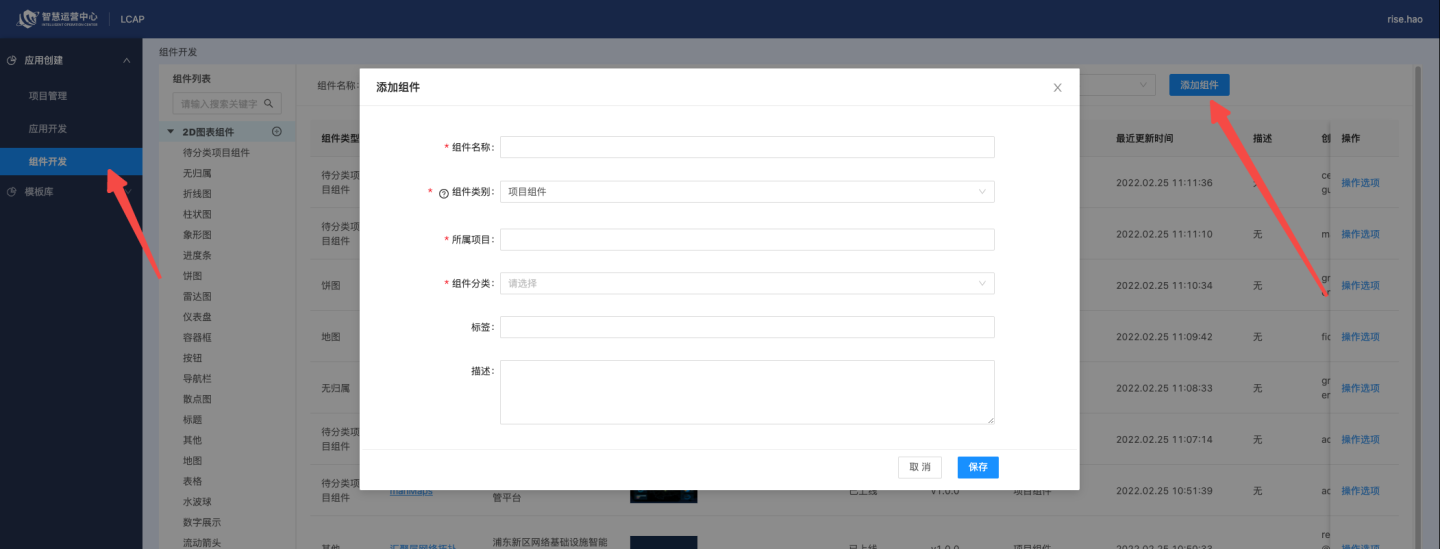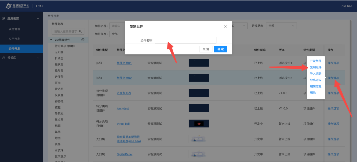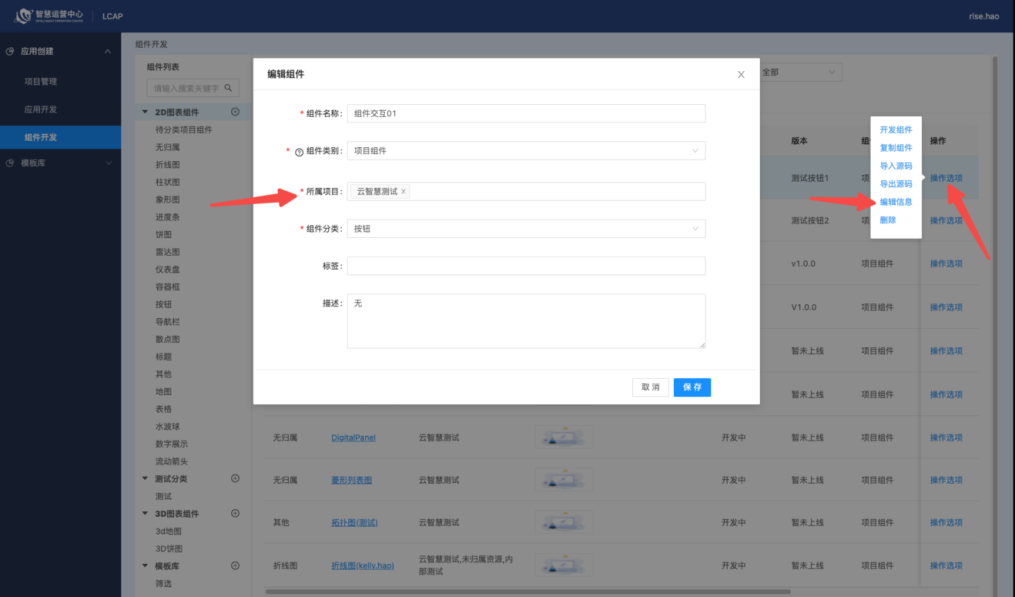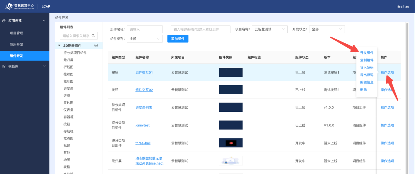 2. 项目组件开发,选择刚刚创建好的项目组件、点击开发组件