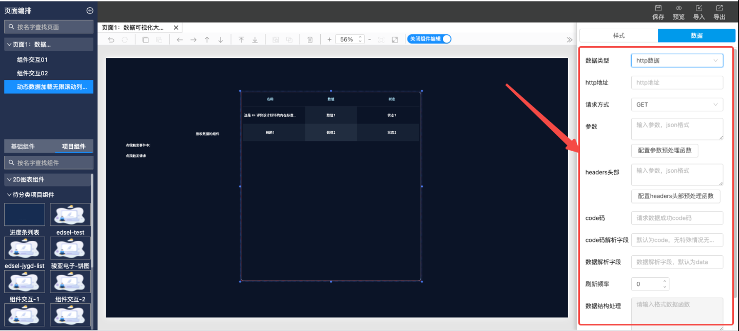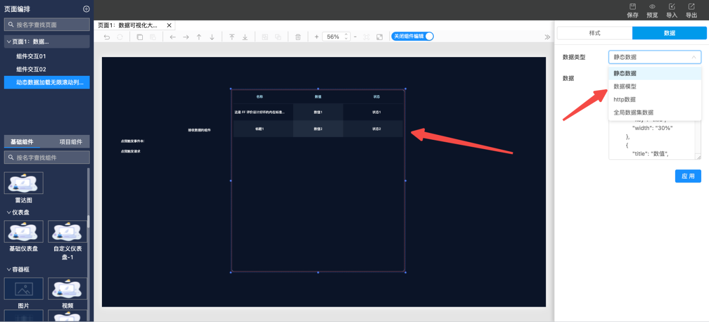 选择适合的基础组件拖入可视化大屏内需要摆放的位置,去选择合适的配置满足UI的需求,