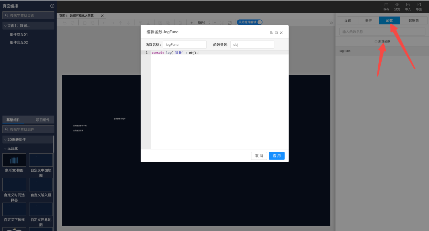 自定义函数,常见的用法是提供给大屏的事件使用。