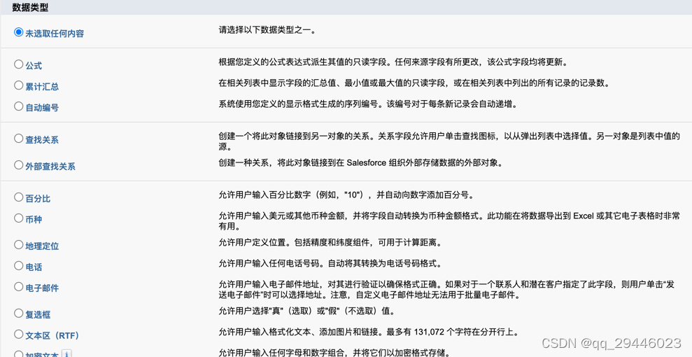 相对于对象,字段(Field)的信息就比较复杂了。每个字段都需要有个数据类型,一个字段只能属于一个对象,字段的APIName在该对象上面必须得唯一。每个不同数据类型的字段也有自己的特殊属性,比如说数字型的,那么它的长度是多少,小数点位是多少?Lookup型的,那么他关联到哪一个父对象?这些业务逻辑,都需要在创建新字段的时候进行校验。确保我们创建数据模型的准确和严谨。