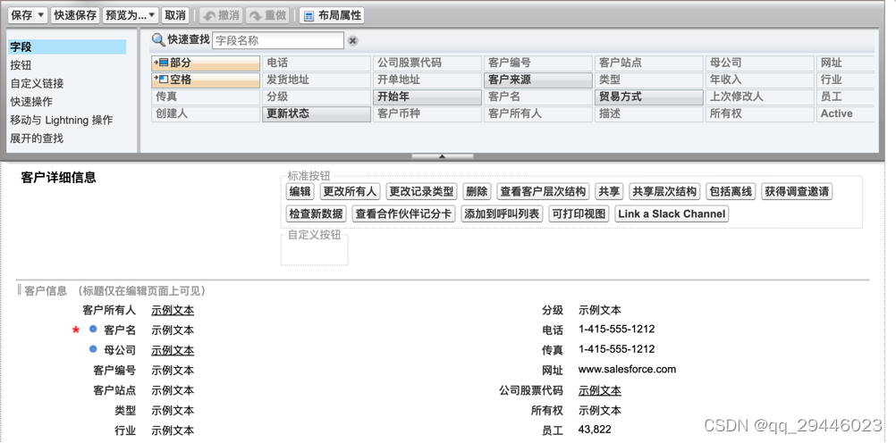 页面布局(PageLayout)在前端加载和编辑一条记录详情的时候使用。页面布局主要有两大块:区域(PageLayoutSection)、相关列表(RelatedList)。一个布局上面会有多个区域,每个区域里面会有不同的字段(PageLayoutSectionField),每个区域可以选择一列、两列或者三列式。