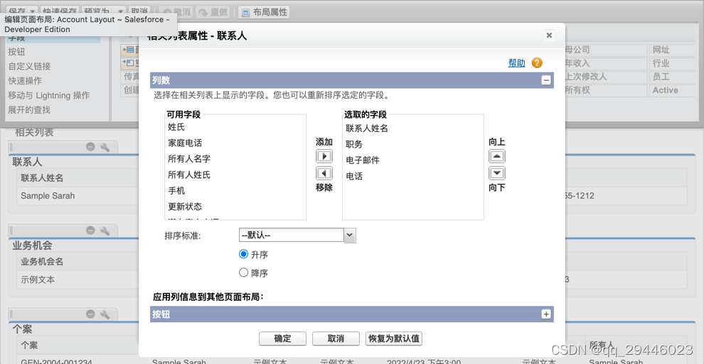 相关列表(RelatedList)指的是展示子记录的列表(创建字段时,谁Lookup你就是你的子记录),这里可以配置要显示子记录的哪些列(RelatedListColumn),以及它们的显示顺序。