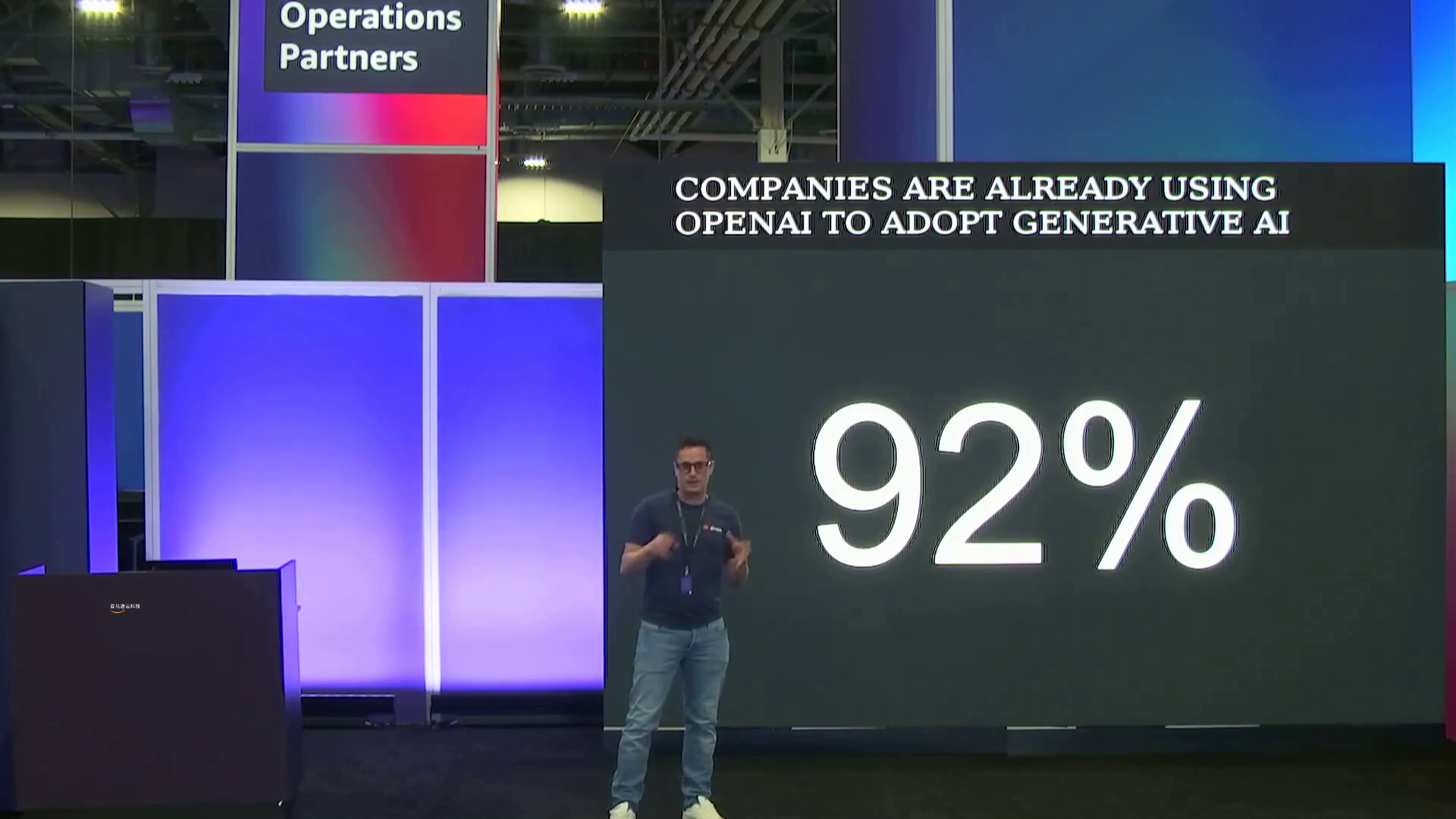 在演讲者的演示开始时,他揭示了一个令人惊讶的事实:在《财富》500强公司中,已经有高达92%的公司开始利用生成性人工智能的能力来改变其业务运营和客户互动。为了展示生成性人工智能的广泛应用,他详细描述了它是如何解决各种不同群体的各种问题的。例如,学生们已经开始将其作为辅助工具来帮助完成作业。各行各业的专业人士,如公共演讲、写作甚至非英语母语者,都在利用生成性人工智能来改进和完善他们的内容。例如,演讲者本人就使用了生成性人工智能来改进他的演讲内容和表达方式,并鼓励观众提供关于这种技术是否有效的反馈。
