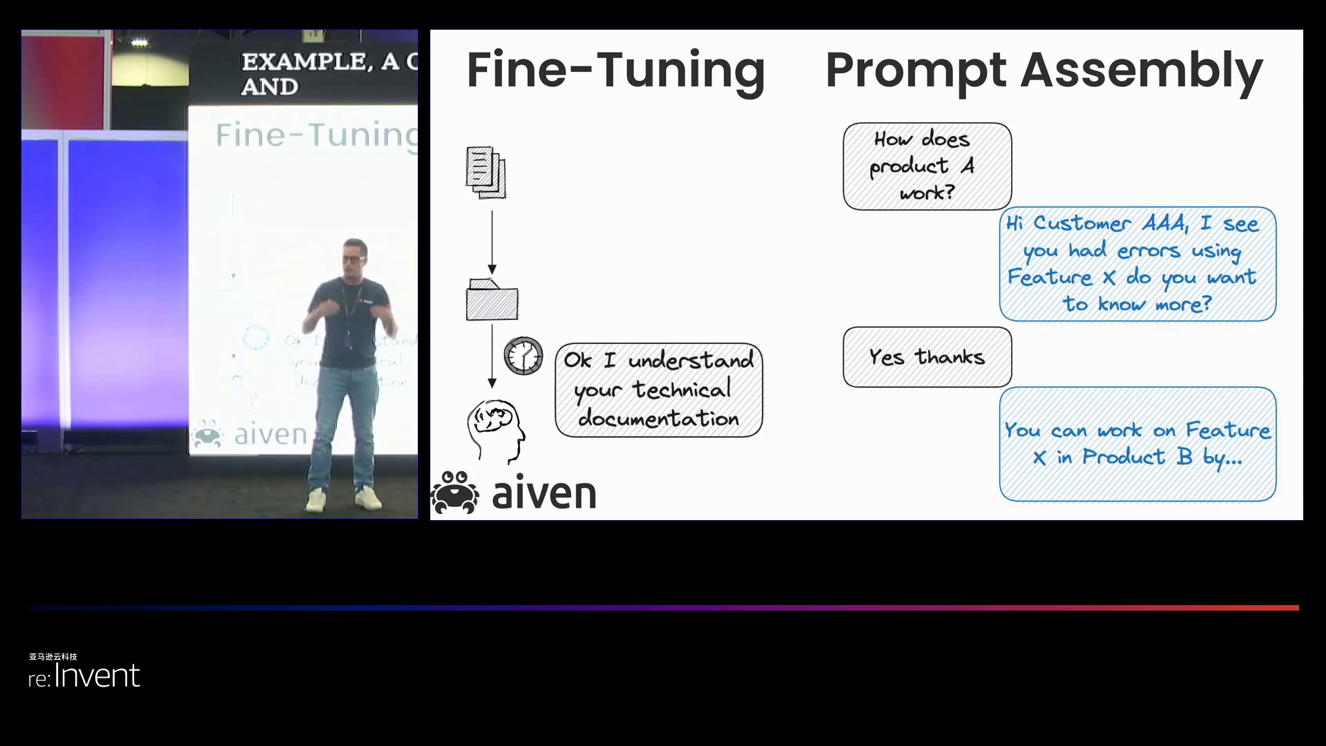 在研究生成性AI技术的过程中,演讲者深入探讨了如何在商业数据基础上微调预训练模型,以及如何通过提示工程融入客户背景。然而,他强调指出,将实时数据整合到提示工程中,对于在客户互动过程中实现个性化至关重要。他以一个关于产品特性的客户咨询为例,通过加入客户最近在该特性上遇到的错误背景,AI可以提供更具有个性化和相关的问题解决方案。