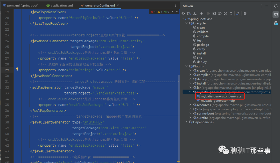 引入反向工程mybatis maven插件。由于在生成Java POJO时,需要连接数据库,所以也需要引入mysql驱动包。