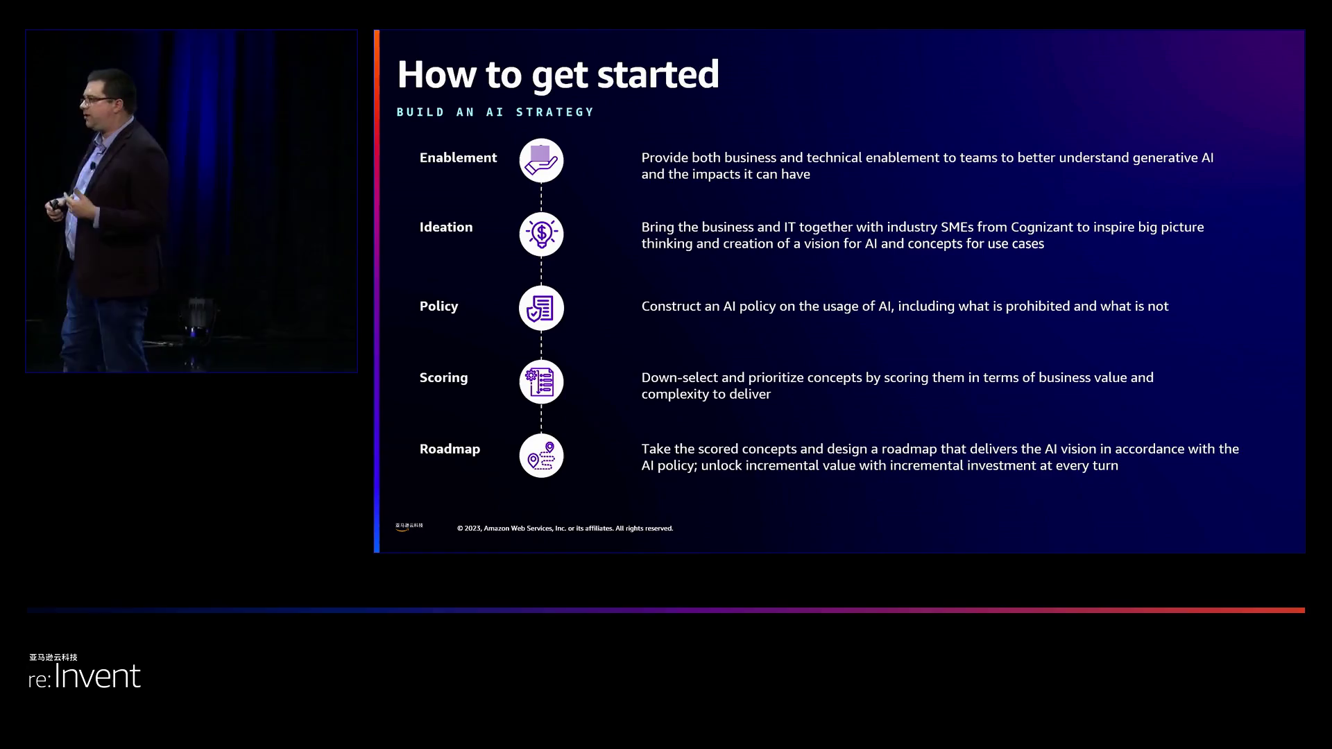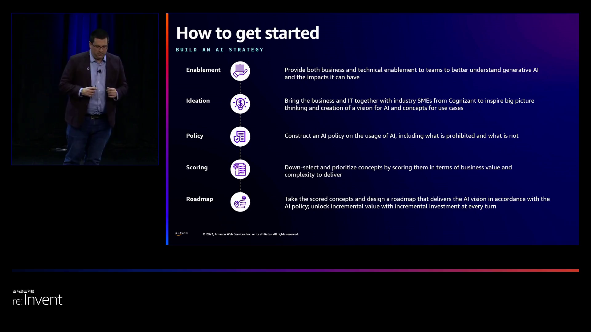 该视频探讨了Cognizant公司在实施生成性人工智能策略方面的实践,主讲人包括Naveen Sharma、Phil Walker和Nick Wills。Sharma详细介绍了Cognizant公司在收集员工意见以寻找具有重大影响的AI应用过程中的操作。他们设立了一个网络化的工作室,让客户能够学习并进行实验。Walker阐述了Cognizant公司如何运用亚马逊云科技服务(例如Bedrock和SageMaker)来保障其生成性人工智能架构的安全。他还展示了一种方法,使客户能够快速从创意阶段过渡到具备已验证商业案例的原型设计。Wills分享了Cognizant公司与业务流程外包公司Williams Lea的合作经验,共同快速开发并部署AI解决方案。所面临的挑战包括寻找合适的应用场景、获取专业技术、提高上市速度、优化资源分配以及调整商业模式。在短短18个月内,Williams Lea成功推出了6项新的AI功能,提升了效率,创造了新的收入来源,并改善了利润率。演讲者们强调了关注高价值应用场景、借助合作伙伴关系以及始终将客户需求置于首位的必要性。