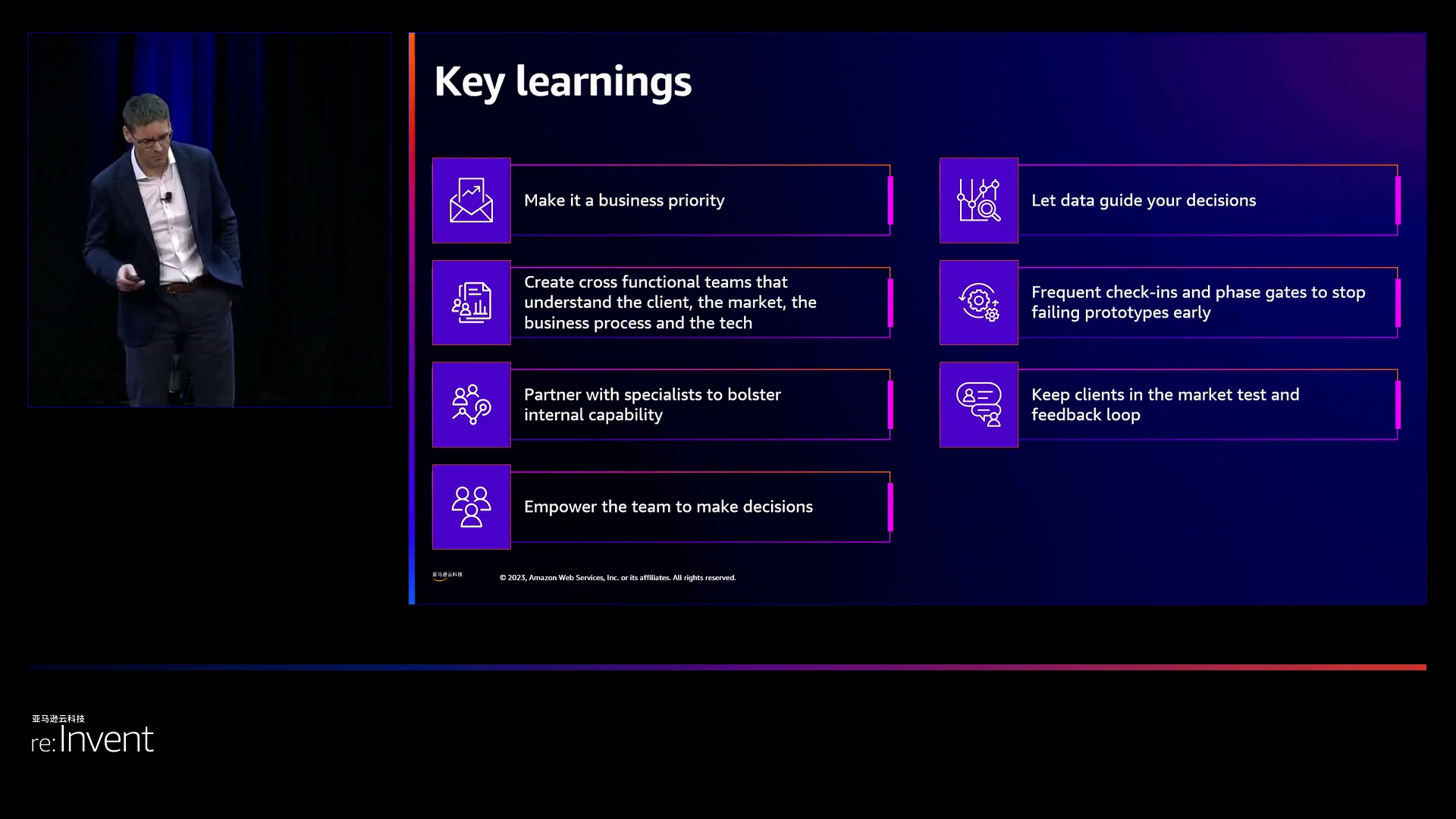 威廉斯·里亚认识到了Cognizant快速原型制作方法的重要性,这种方法能在8周内建立起价值证明。这些工作原型包括了在亚马逊云科技上运营的预估投资回报率相关的业务案例模型,包括成本、支持需求、定价和预期采纳等因素。在短短18个月里,威廉斯·里亚推出了6项新服务,并计划推出另外4项,实现了效率提升、新的收入流以及声誉增强。回顾所学的经验教训,尼克强调找到合适的应用场景是至关重要的,但这却非常困难。要跟上生成性人工智能技术的快速发展,需要专门的合作伙伴。采用MVP(最小可行产品)方法可以加速上市进程,而跨职能团队的参与和早期的客户反馈也非常重要。
