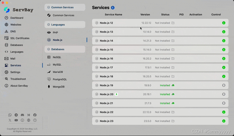 ServBay提供了一键安装和部署开发环境的功能。不到3分钟,ServBay就能帮助开发者轻松搭建起所需的Node.js开发环境。