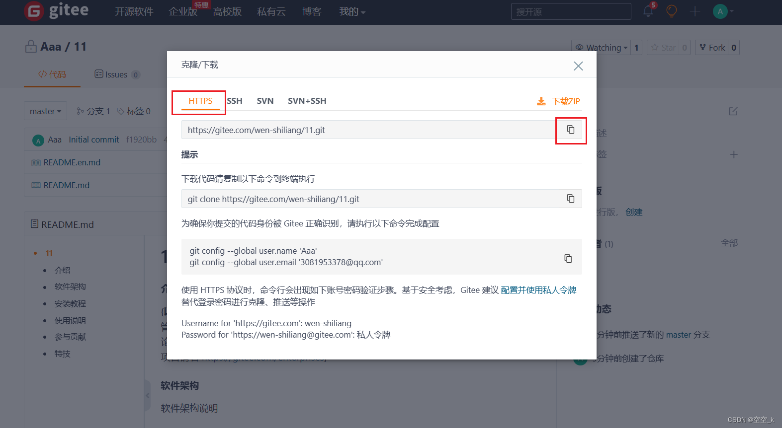第一步:切换到指定仓库,点击克隆/下载按钮,并选择HTTPS,最后点击复制按钮。