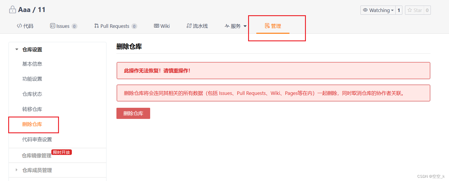 进入指定仓库,点击管理选项;找到仓库设置 -> 删除仓库选项切换到删除页面,最后点击删除仓库按钮。
