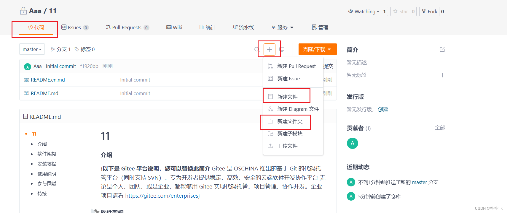 切换到指定仓库,选中代码选项。点击文件,选择创建文件或文件夹。