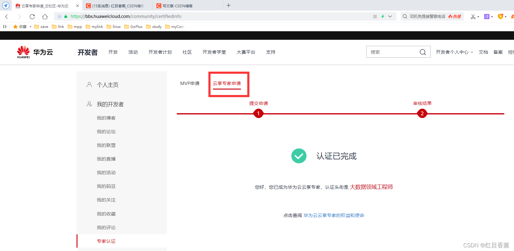 可以看到【云享专家】的标识,同时左侧菜单中可以看到【专家认证】选项。