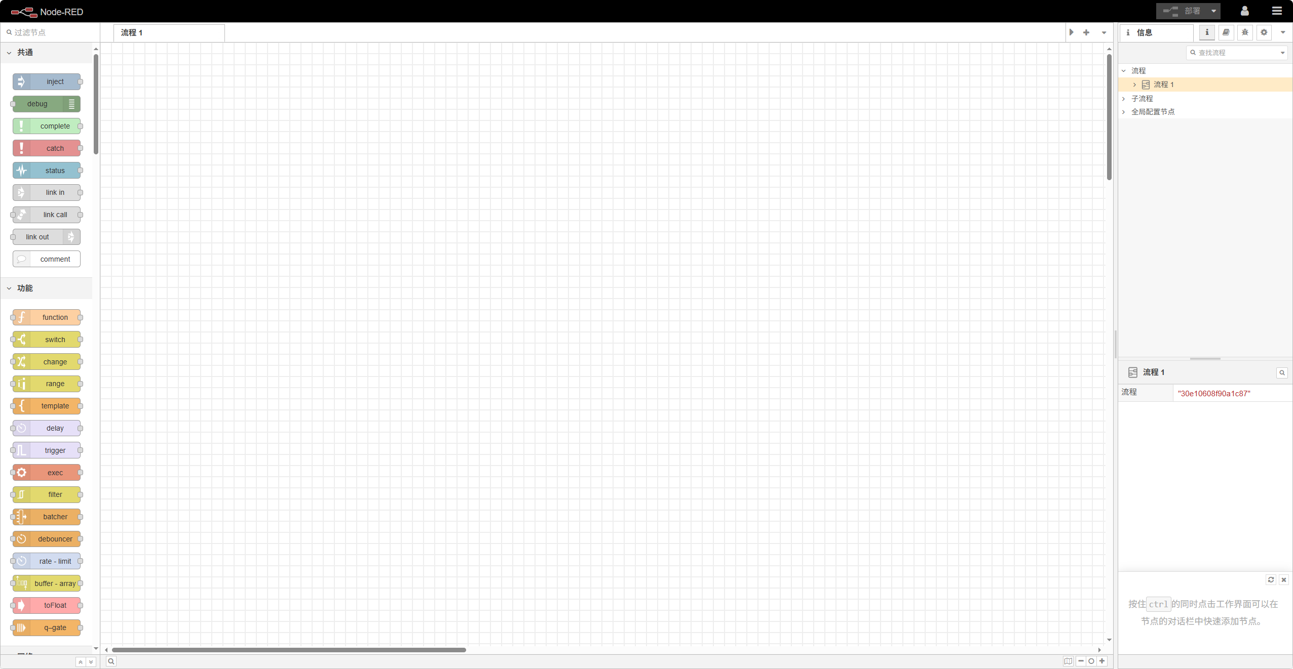上图是Node-RED的界面展示,可以看到在界面的最左侧有很多椭圆形方块,每个椭圆形方块都是一个Node-RED节点,每个节点都代表了一个或者一类功能,这些节点有的是默认就有(搭建了Node-RED就有,不用下载安装),有的需要从Node-RED中心下载,有的则是个人私有,这些私有节点是边缘计算终端用户为了完成某一个或者某一类功能独自研发的节点,这种私有节点在终端用户没开放上传前无法从Node-RED中心下载获取。