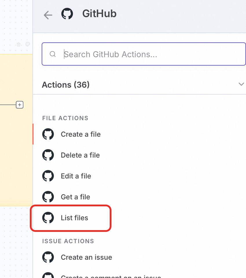 在n8n平台上添加工作节点,选择 GitHub 的 List files 节点