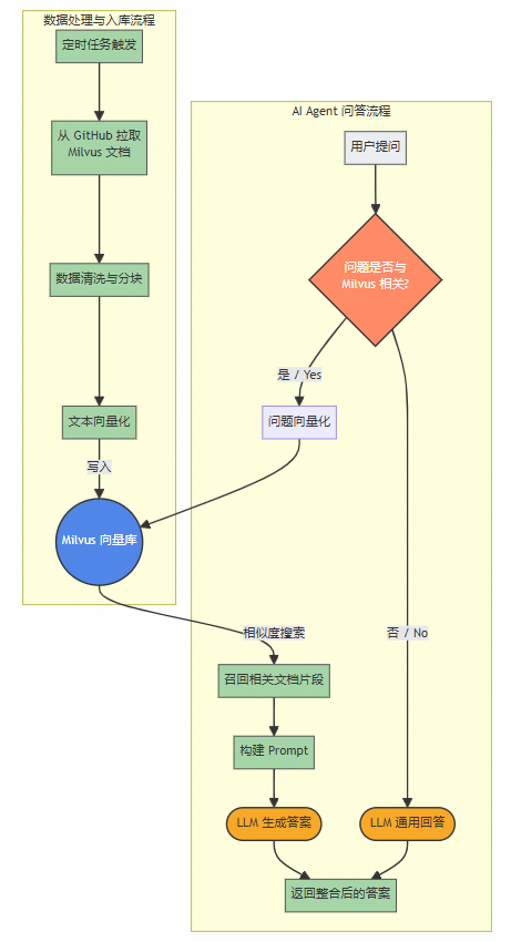 为了达到快速搭建一个企业级的垂直领域智能问答应用的效果,我们将在n8n中创建两个工作流。其中第一个工作流用来定时拉取GitHub上Milvus产品的文档数据,写入Milvus向量库中。第二个工作流使用AI Agent,结合大模型的能力判断客户的提问,当问及的问题与Milvus产品相关就从Milvus向量库中召回问题对应的答案,将答案整合到大模型的输出中返回客户;否则就直接通过大模型进行一个通用的回答。