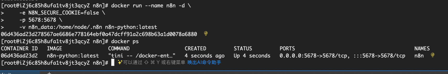 输入以下命令,创建一个名字为n8n_data的数据卷,并创建n8n运行容器