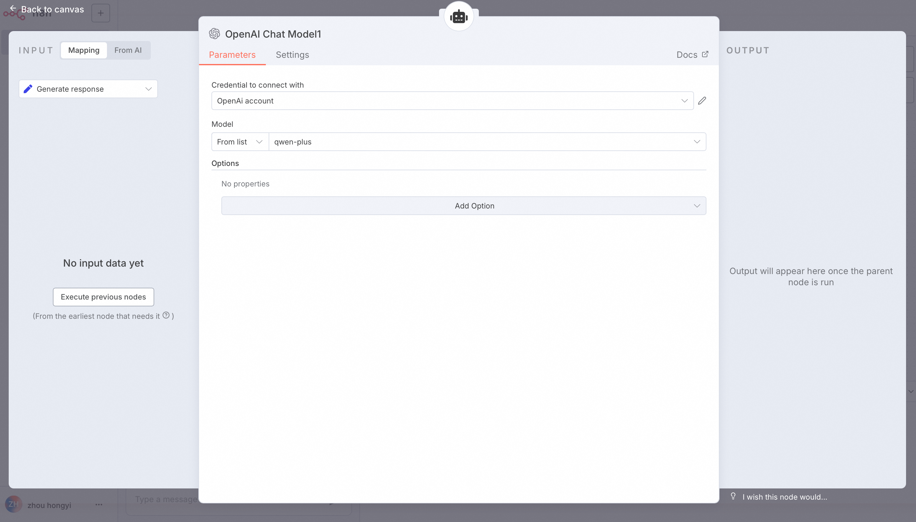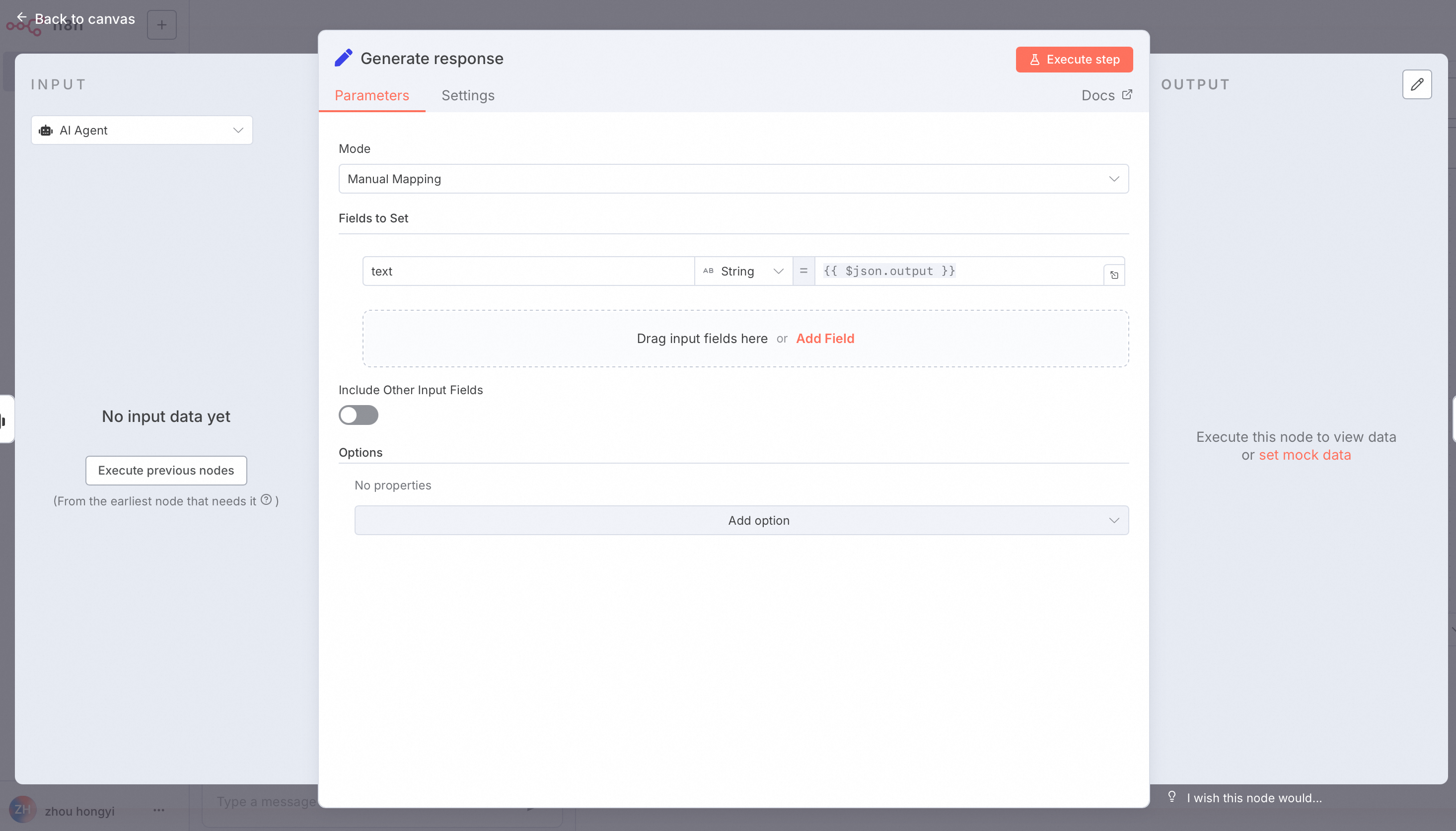 接下来创建一个AI Agent节点,通过接受Chat输入,当客户搜索Milvus相关信息时,我们希望从之前创建的知识库进行内容召回,除此之外,采用大模型的默认输出返回。在本例中,输入以下内容作为System Prompt