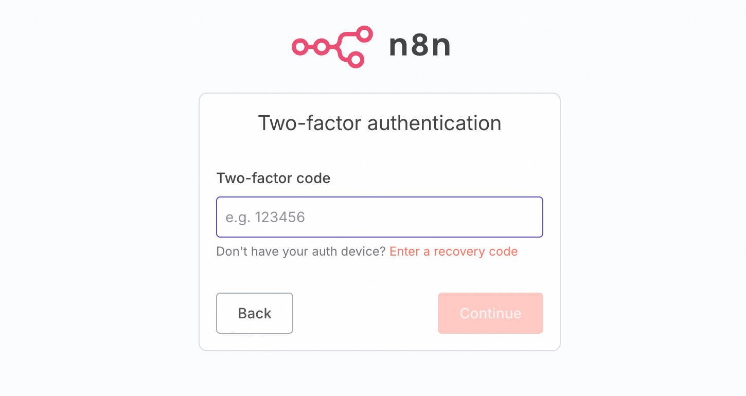 此后,在输出账号密码后,还需要输入2FA code,n8n的安全性再上一个台阶!