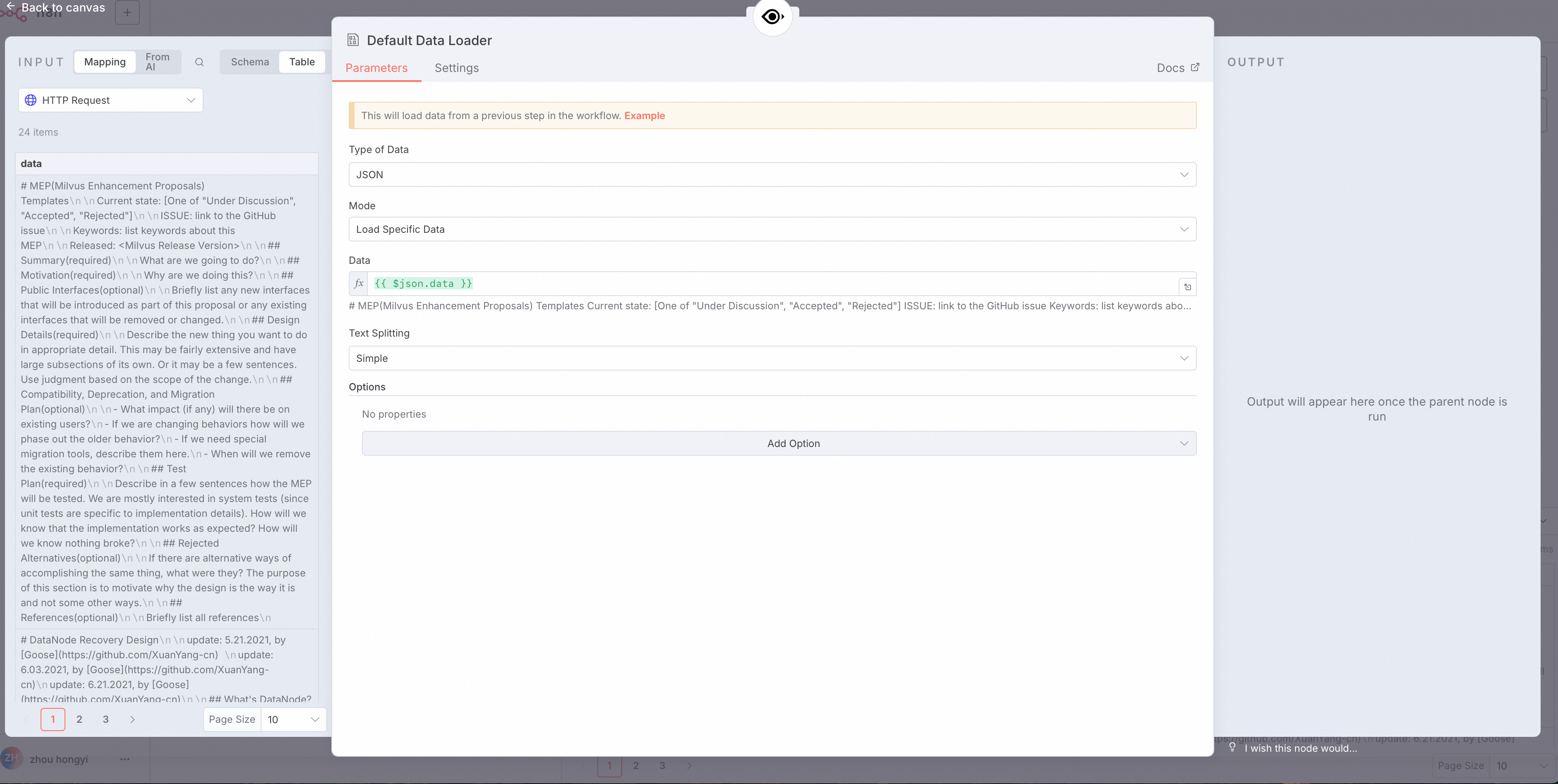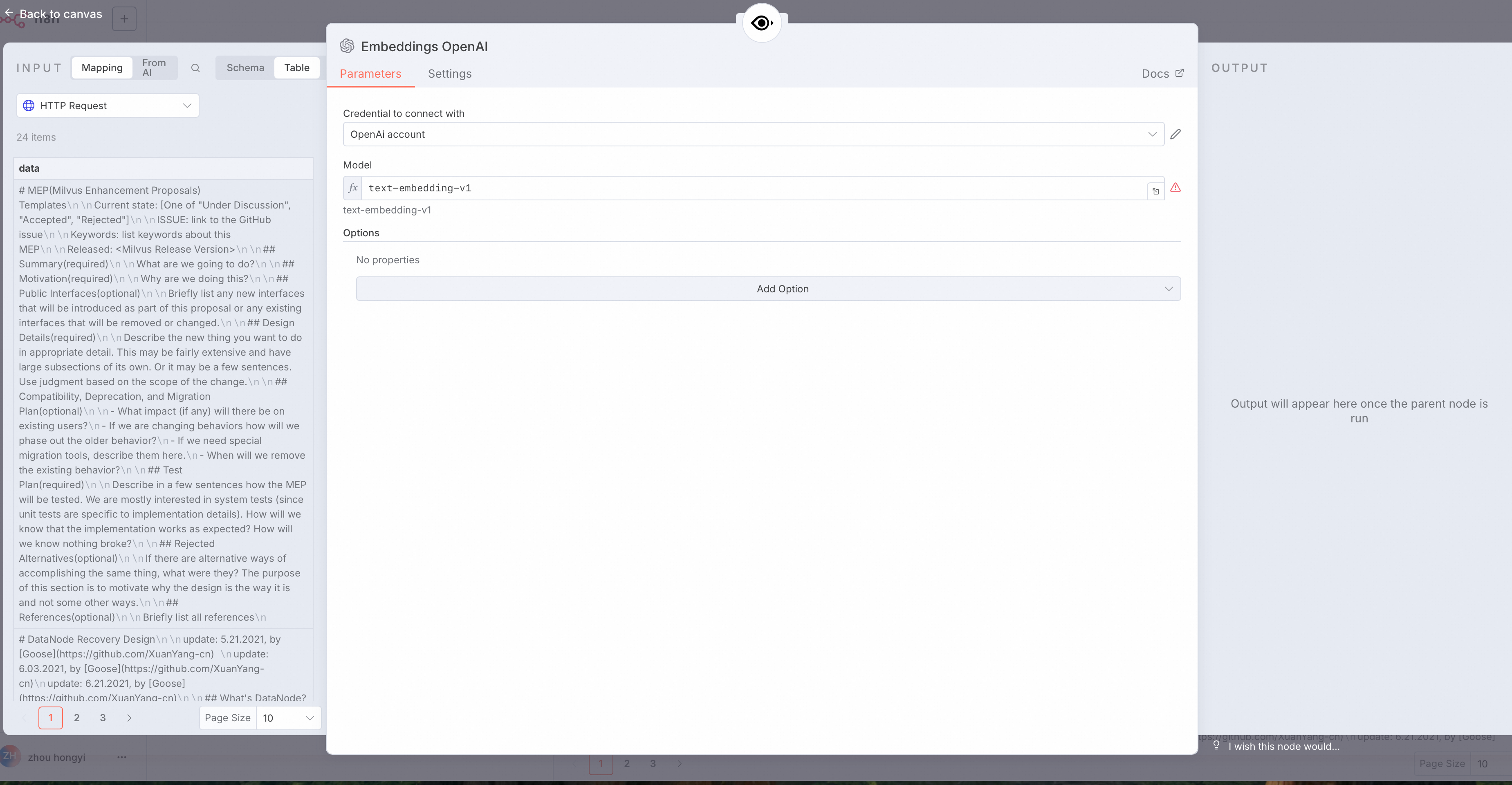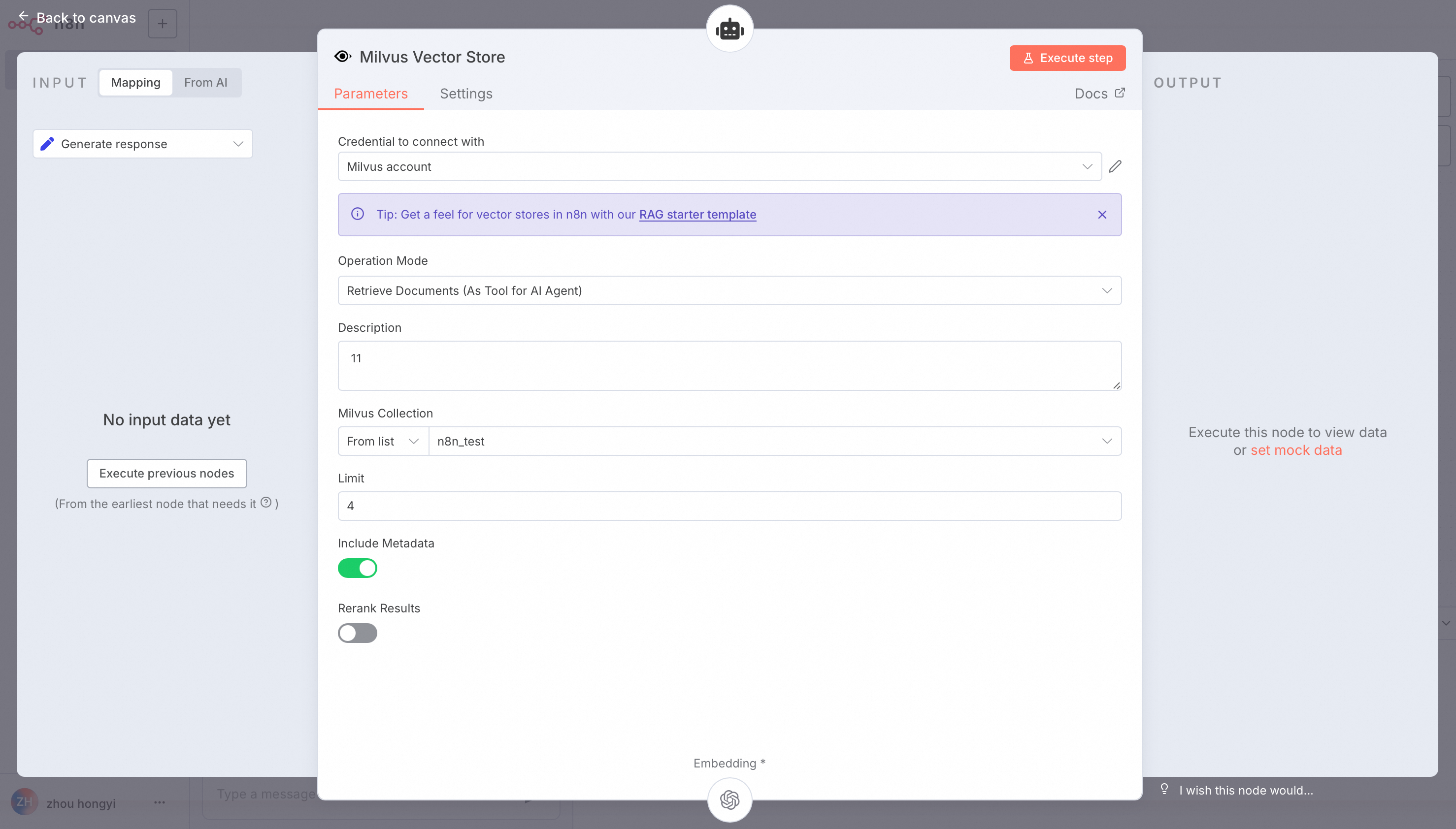 接下来就需要对解析的网页内容,向量化后输入milvus数据库,我们在上述工作流的基础上添加一个后继节点Milvus Vector Store,选择Milvus接入的Credential,选择一个collection,这里使用了n8n_test,为了便于测试,选择Clear Collection开关打开,这样每次插入时会自动清除数据。