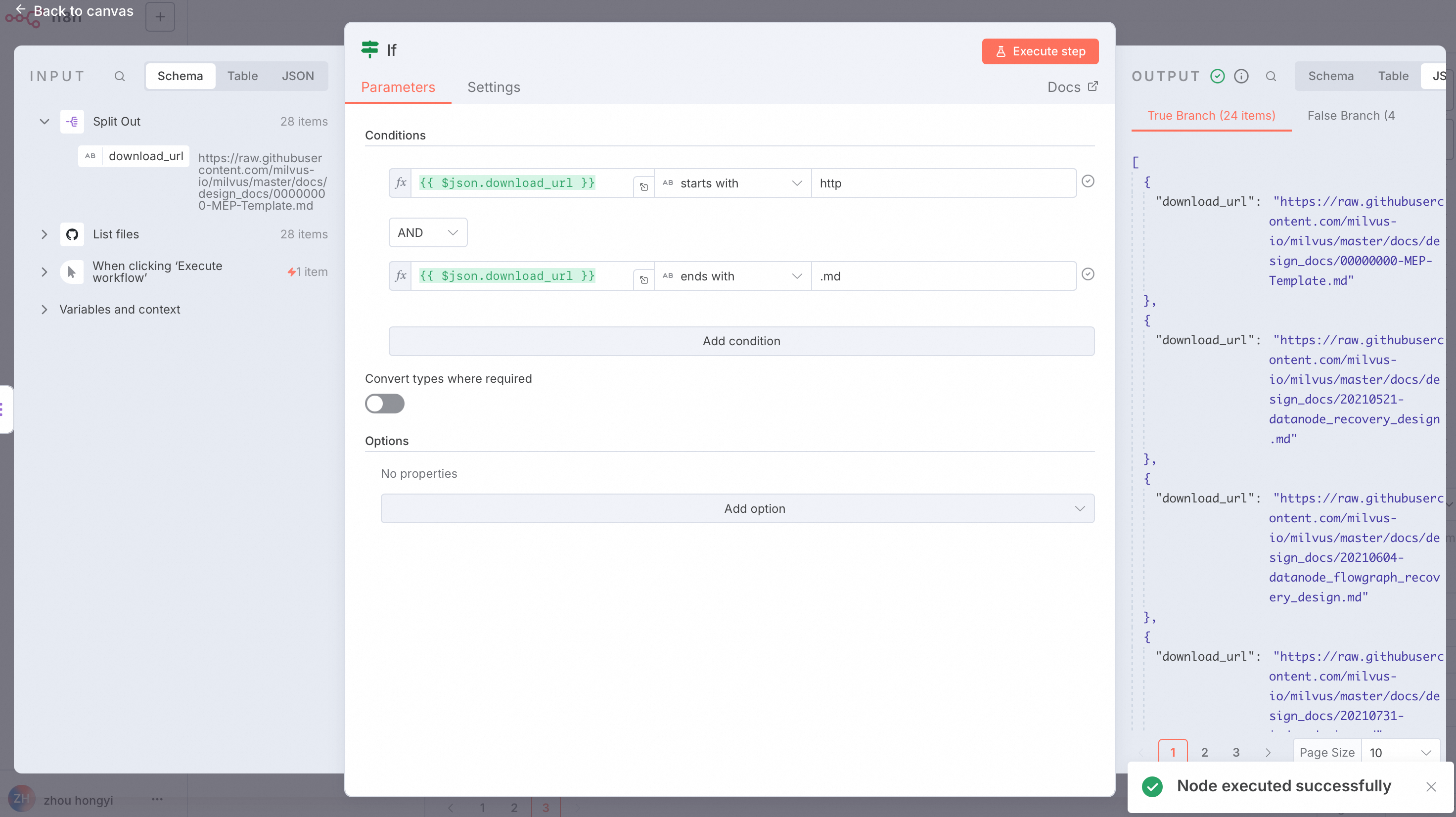 为避免执行后可能会出现null 或者.png结尾的文档,进一步可能影响后续Http获取的正确性,所以我们还需要配置一个If Node,过滤掉null和非.md的链接,If Node节点具体配置如下图所示。