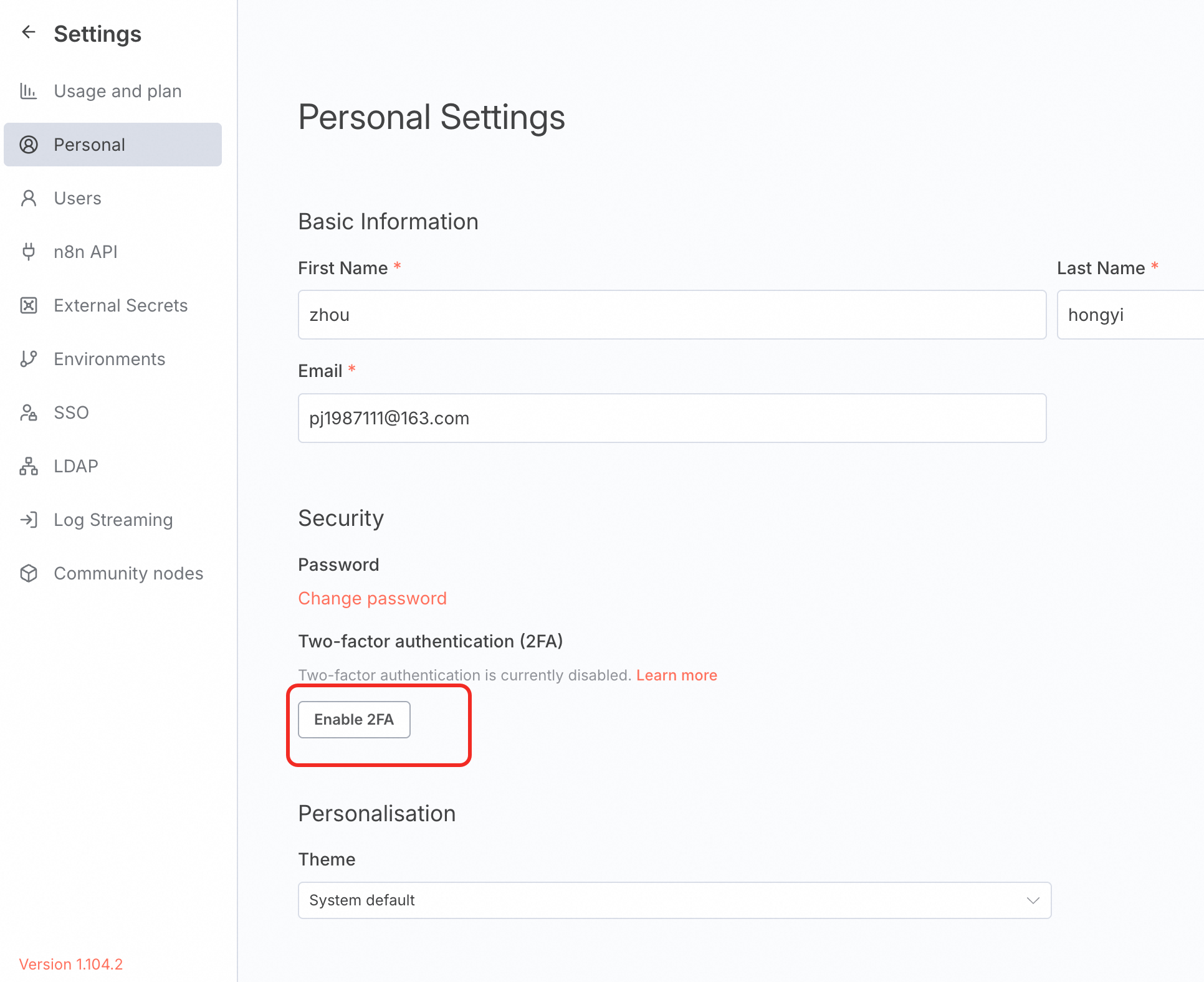 首先登录你的n8n,点击左下角的齿轮图标进入 Settings,然后选择 Personal。在这里,你会看到 Two-factor authentication (2FA) 的选项,点击Enable 2FA。