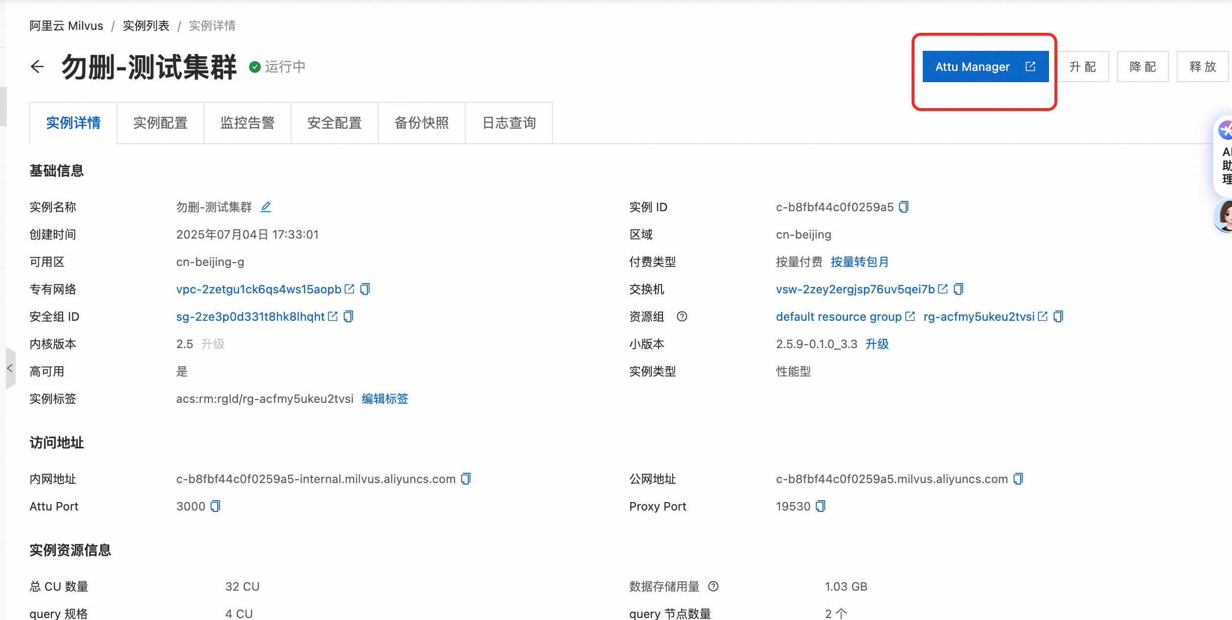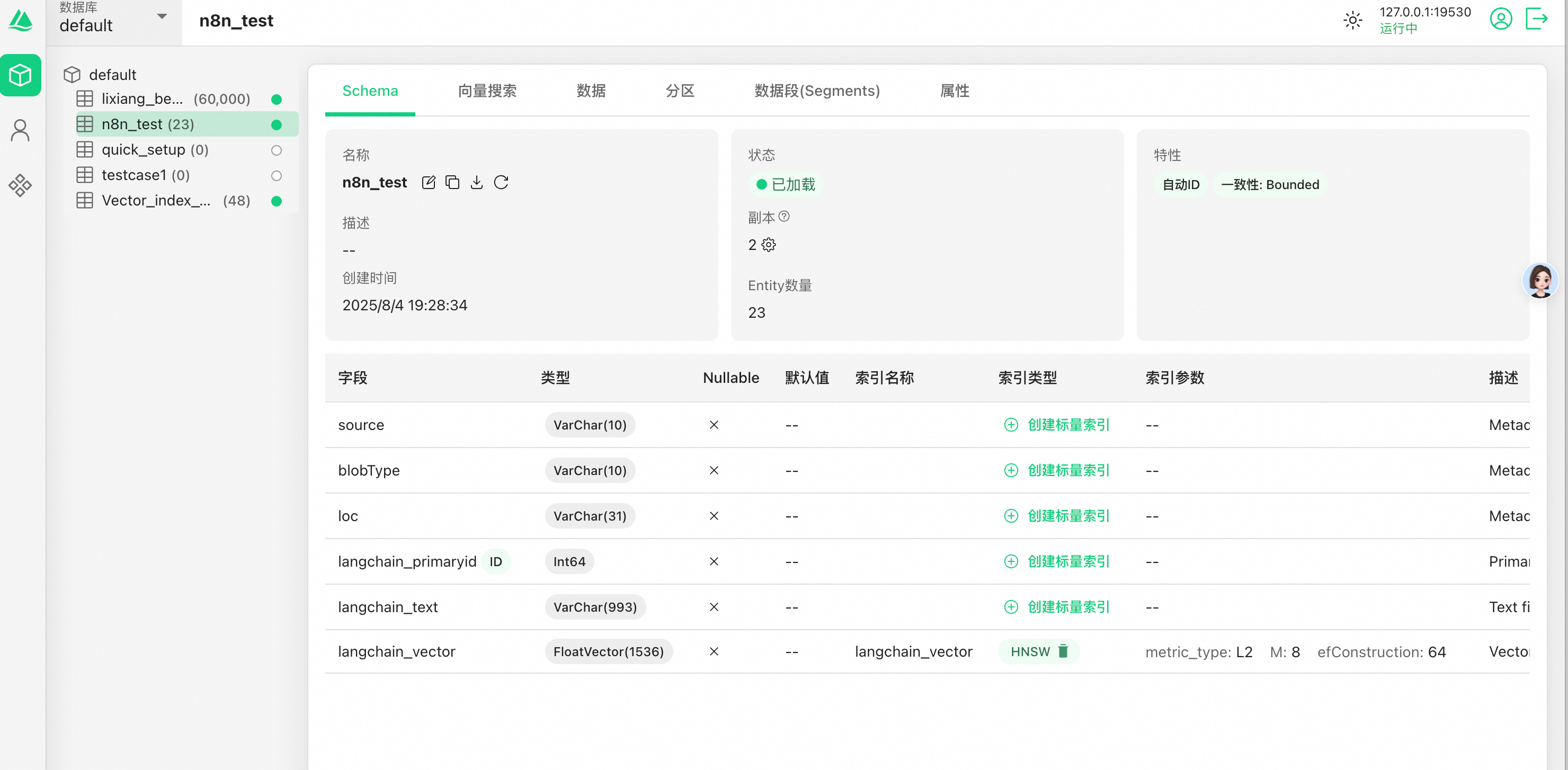 验证阶段登录阿里云Milvus控制台,选择您配置的Milvus实例,单击右上角Attu Manager进入Attu页面,可以看到对应的n8n_test collection 数据已存在,点击加载collection,左侧collection处显示绿灯,且有加载entity即可。