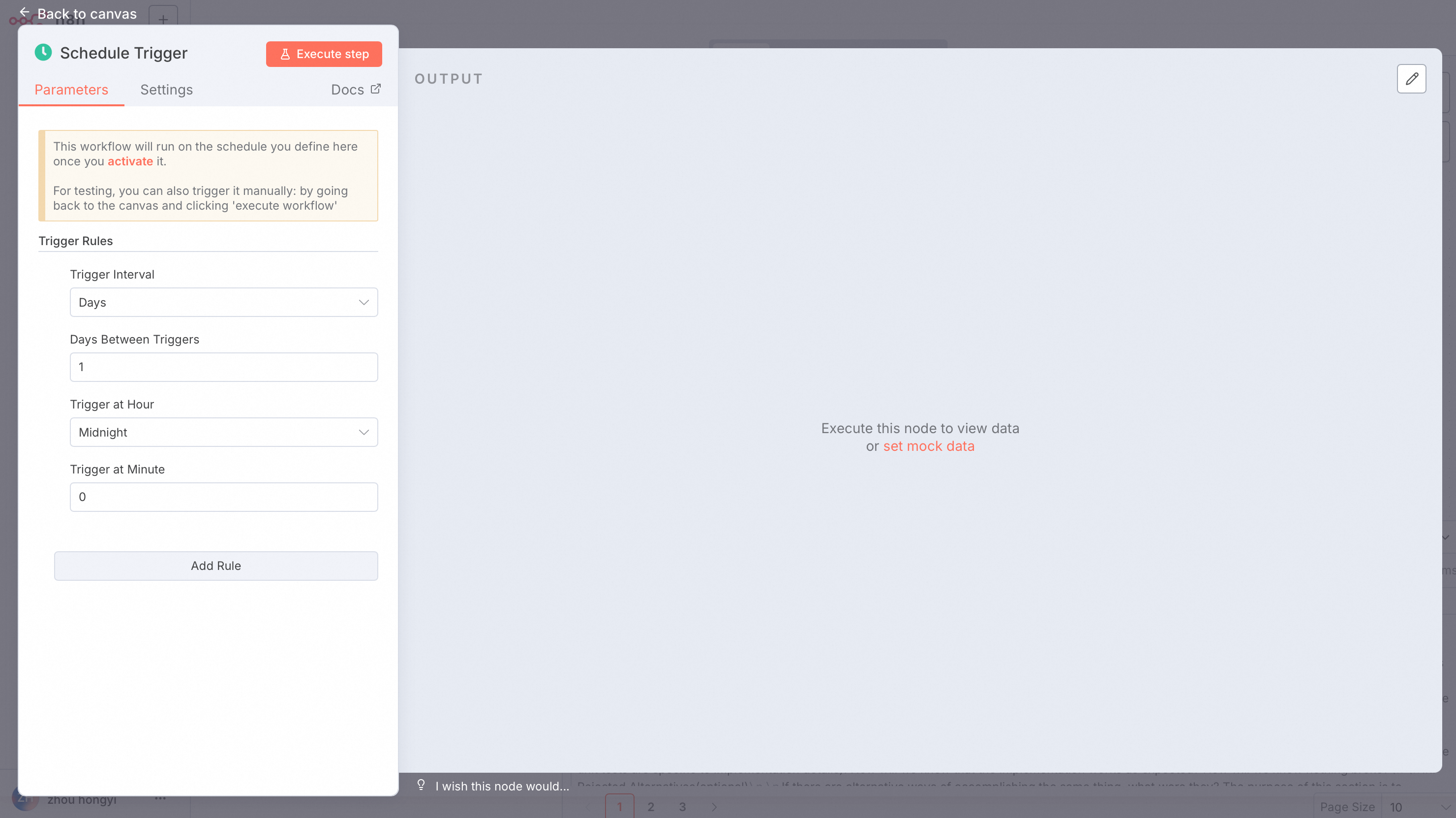 最后,因为考虑到github上文档的实时性,我们需要定时同步所有文档,因此添加一个Schedule Trigger节点,定时执行,放在最前面进行工作流的触发,具体配置如下,我们这里选择定期同步的周期为每天。