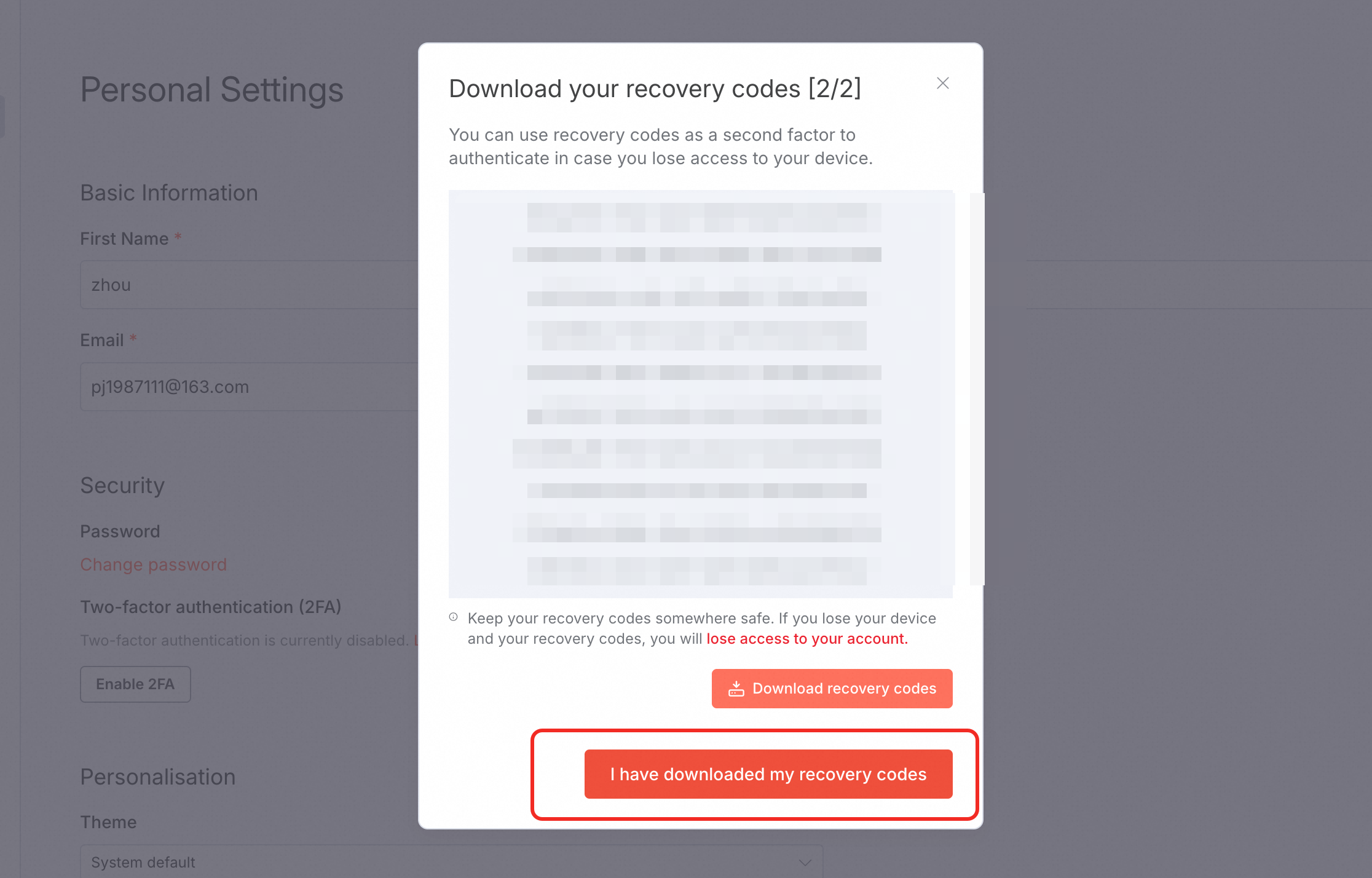 启用2FA后,n8n会提供给你一组一次性的恢复代码如下图,最好拿小本本记录一下,若手机损坏丢失后,下次disable 2FA重置时需要提供。