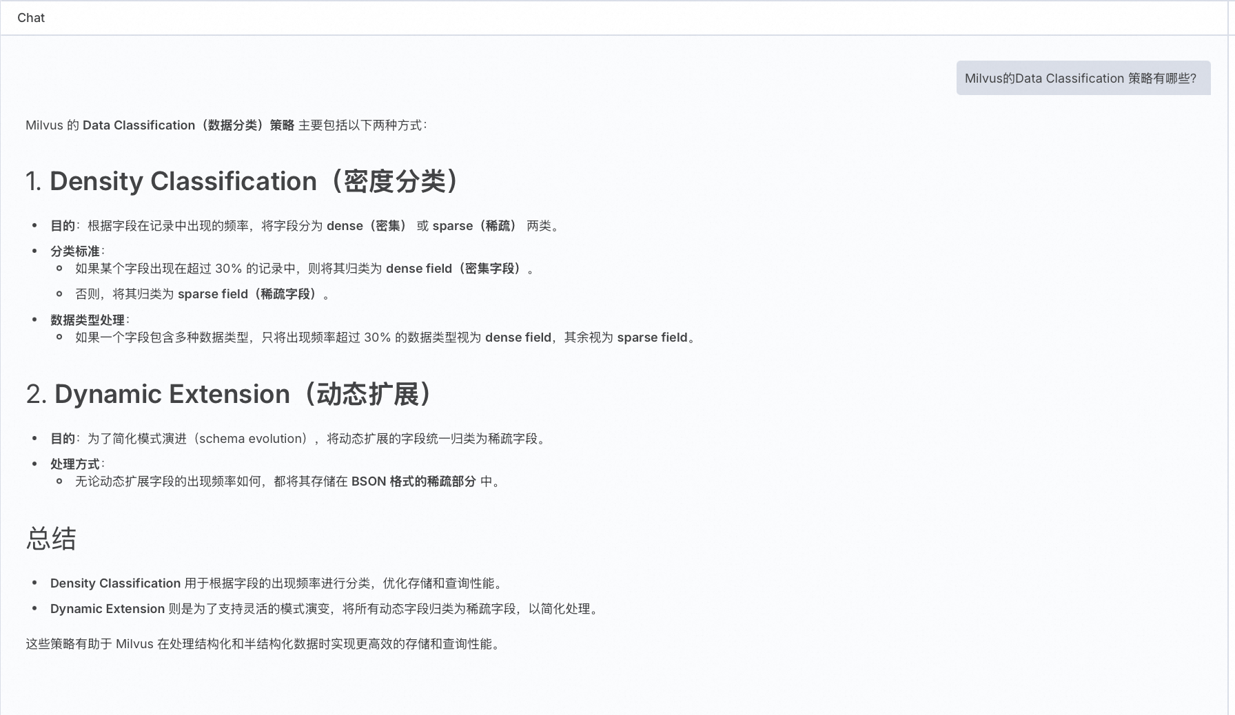 执行Chat工作流,输入一个Milvus相关的技术问题,比如 “Milvus的Data Classification 策略有哪些?”