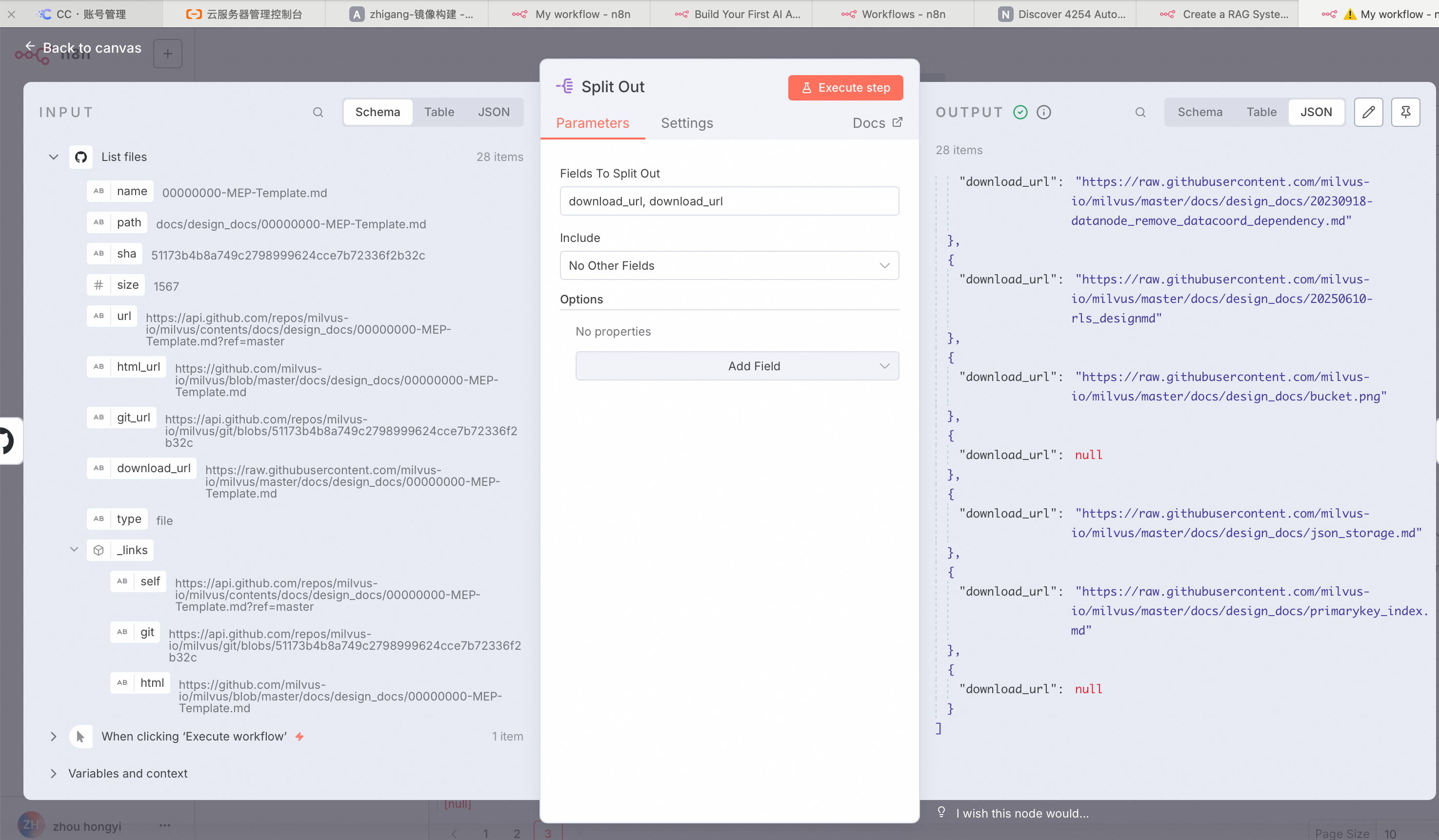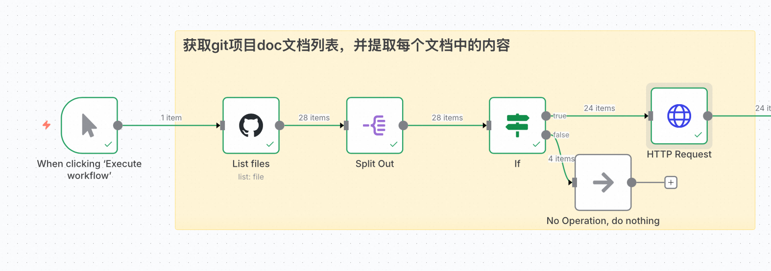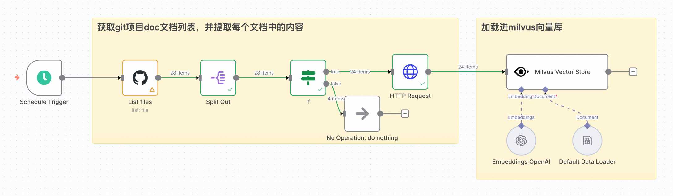 github上提取文档内容以及录入milvus向量库的工作流已经配置完成,如下图所示。