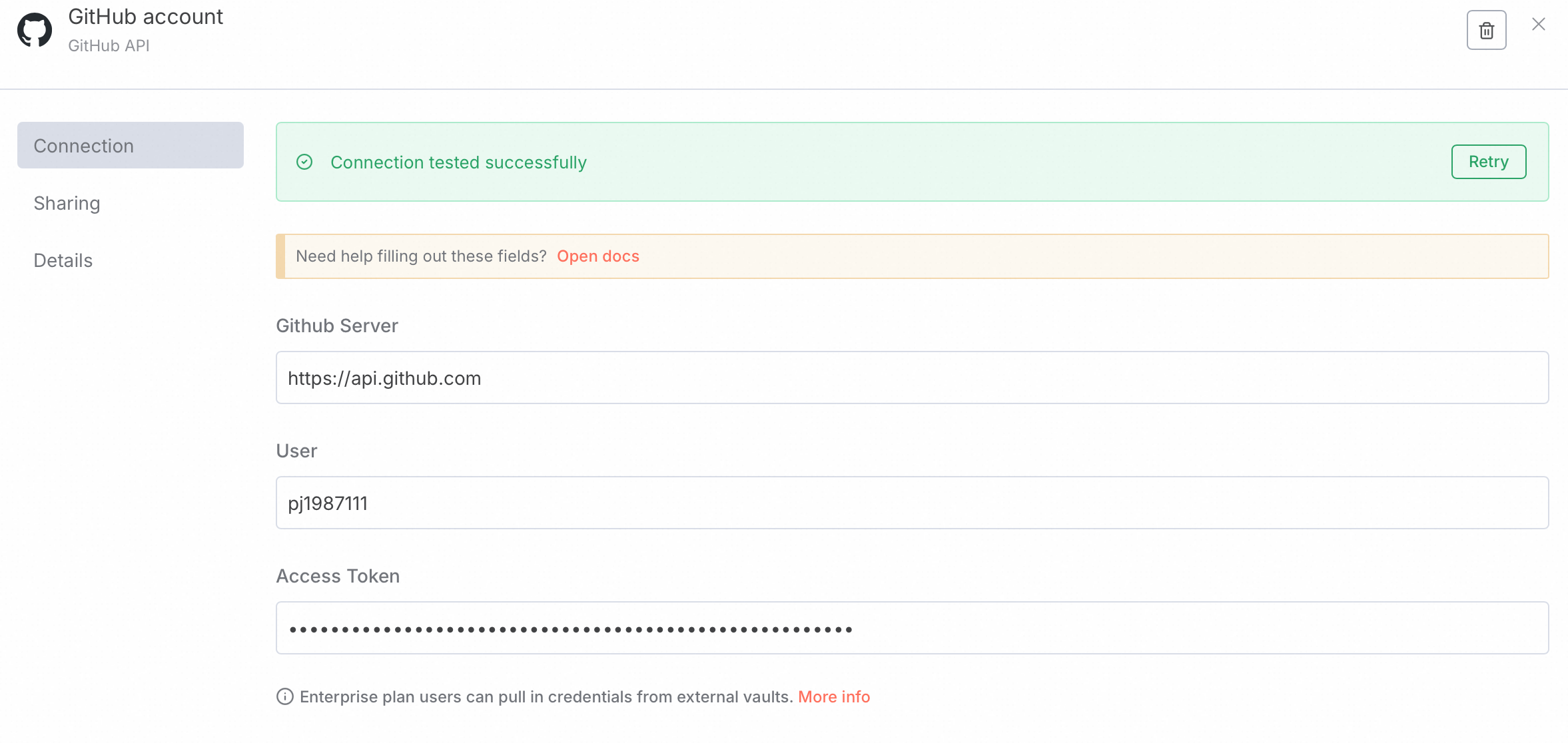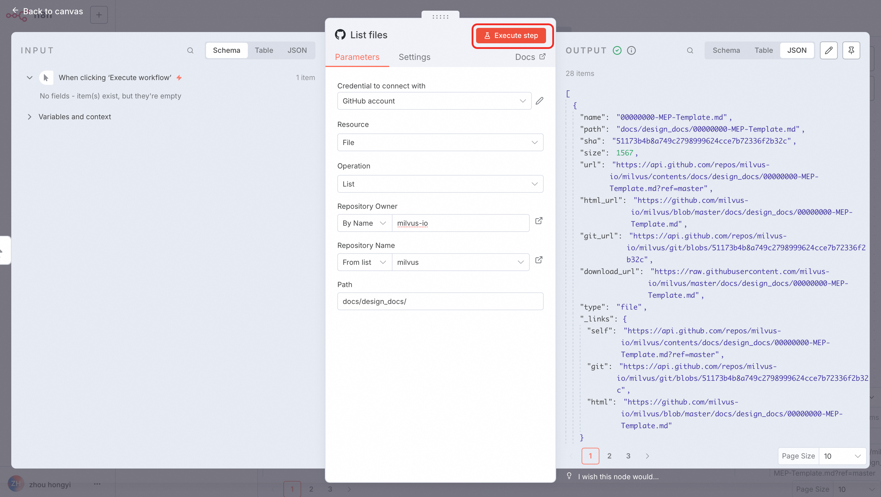 选择GitHub接入的Credential,填写仓库Owner、仓库Name以及需要创建向量的Path,如下图所示,然后执行Execute step查看输出。