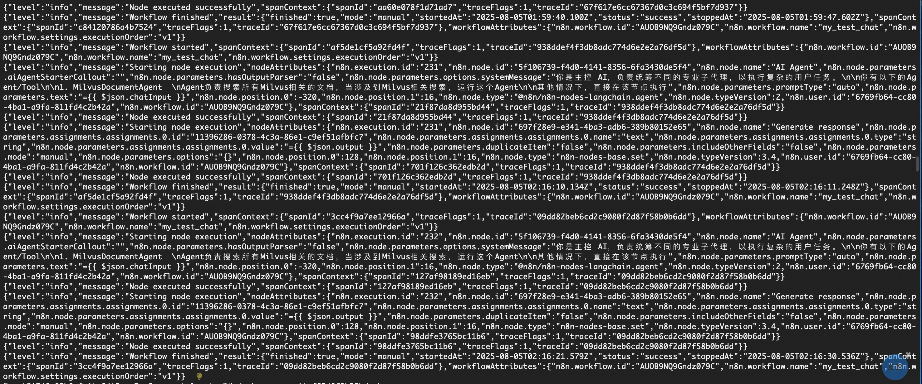 查看n8n的执行监控日志,可以清晰的看到每个步骤的输入输出,如图Milvus向量召回可以看到原始的与内容相关的文档,同时左侧可以看到整个问答的链路以及内部一些细节,体验非常好。